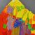 The centerpiece of the composition is a range of majestic mountains rendered in a vibrant and diverse palette of colors. The use of acrylics allows for a rich interplay of tones, with deep reds, yellow, oranges, and green seamlessly blending into one another. These bold and expressive colors capture the essence of the early morning light, casting the entire scene in a radiant glow.