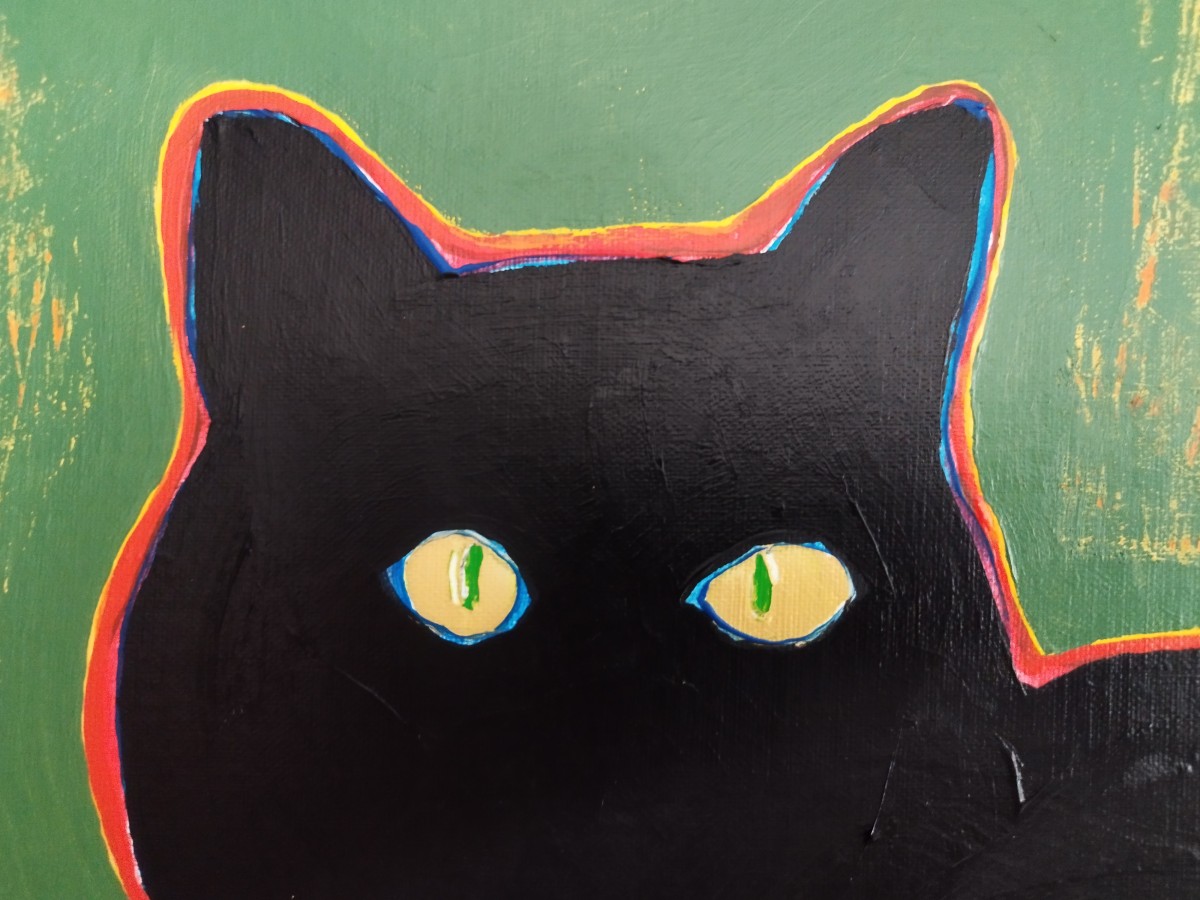 “Chat rasta” ©alainhalter 2023-2024. Châssis entoilé en lin Gerstaecker Classico, Acryliques extra fines Rembrandt Talens, emploi de couleurs fluorescentes. Année : avril 2023-31 août 2024. Format 8F : 46 (largeur) x 38 (hauteur) cm. Tranches peintes. Hors encadrement. Pièce unique.