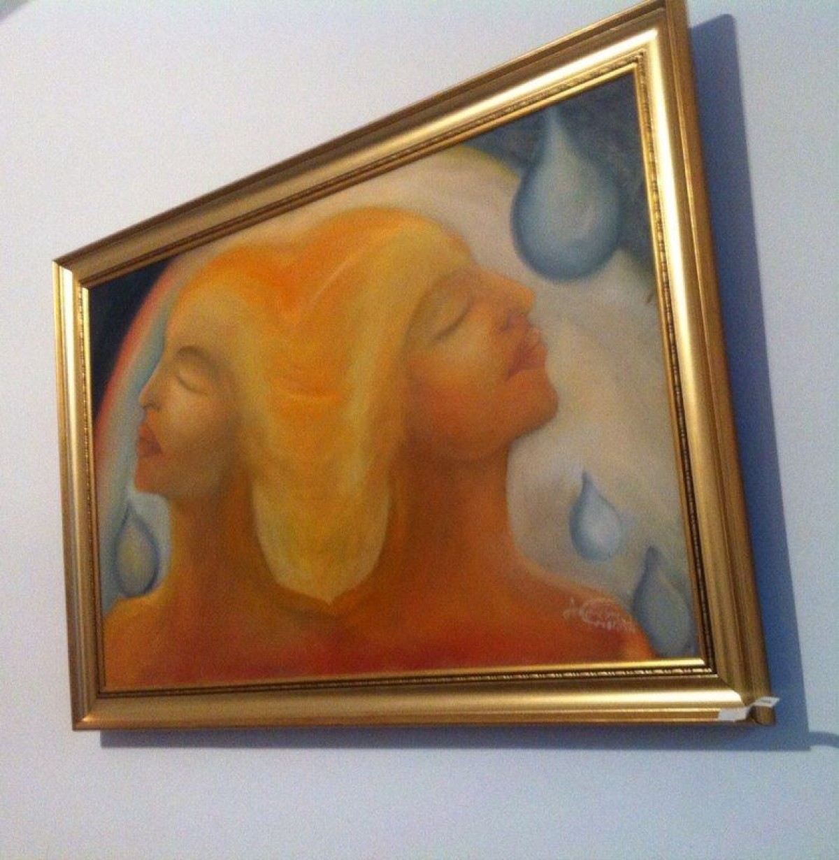 Tablou, ulei pe panza.Lucrarea prezinta o compozitie de tonuri de albastru si accente de ocru .Suprafetele au straturi transparente explorand contrastul dintre zonele luminoase si cele dense invitand privitorul la introspectie si meditatie. Chipurile orientate in directii opuse dar conectate prin energia mentala semnifica emotia transcendenta a unor fiinte care depasesc legatura fizica si se regasesc perpetuu intr-un spatiu telepatic de exceptie.
