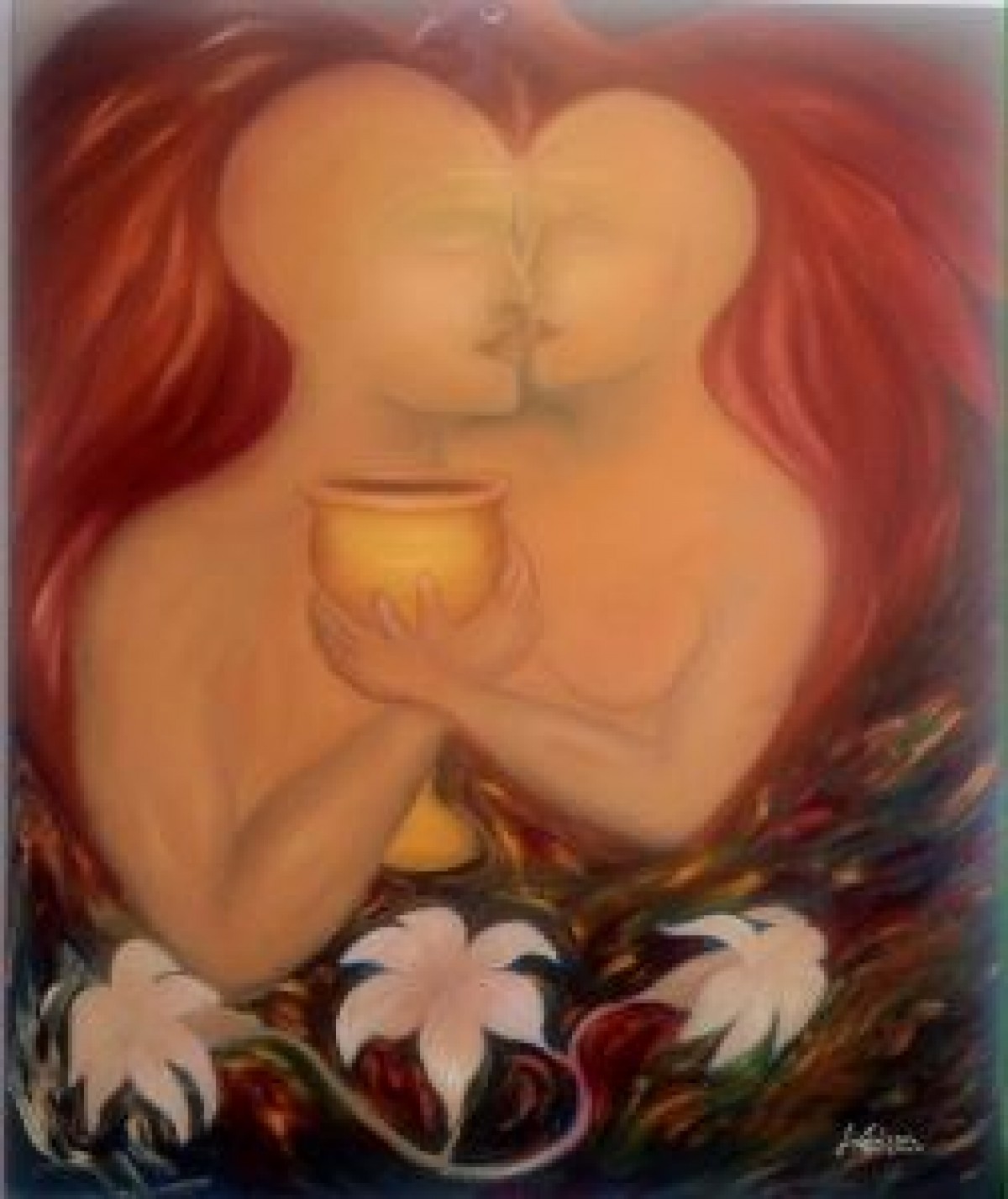 In cautarea acerba a Sfantului Graal, imaginam material ceea ce este in fapt o metafora pentru reintoarcerea la valori care ar fi condus Umanitatea pe un alt drum. Potirul auriu simbolul comuniunii prin iubire ,crini albi semn al renasterii si sperantei , energia care invaluie cuplul ,caldura,vibratie emotionala ,iubire.