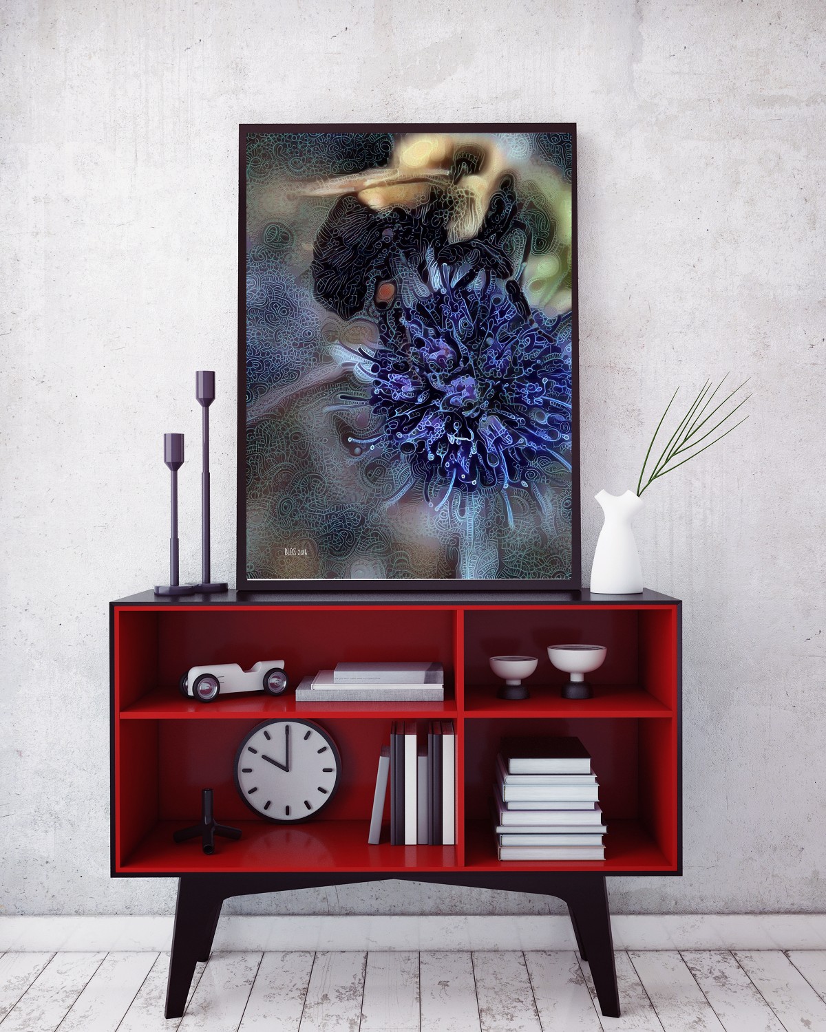 This is a companion piece to my "Bumbly Bee" print - another photo from the same day, the same flower, and possibly even the same bee. The digital effects I applied remind me of the hot summer day and buzzing sound of the bee as it worked.