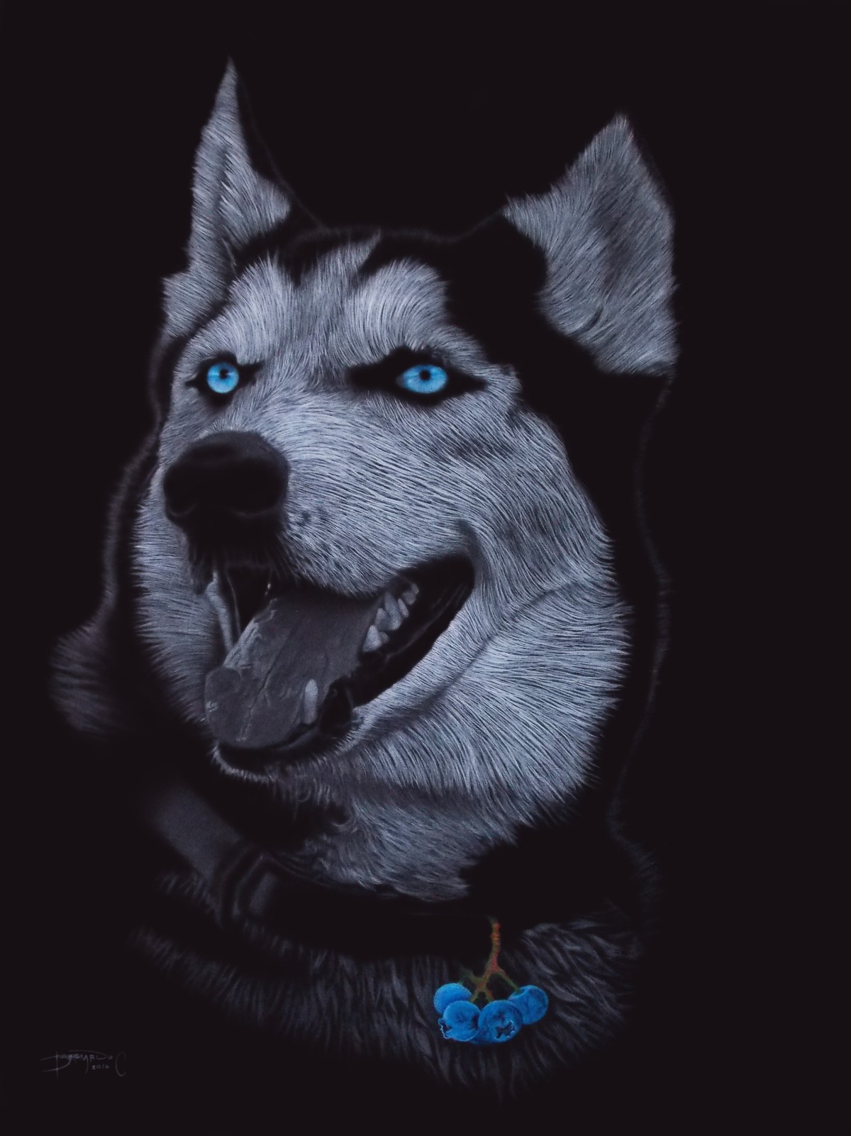 In this drawing I wanted to change the typical dog necklace for a blueberry necklace. I just wanted to emphasize the multiple benefits of the blueberries and of whole fruits in general while at the same time I wanted to make contrast with the white hair of the husky and the blue of the eyes and the blueberries.