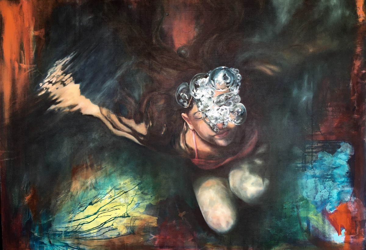 This artwork brings realism and abstract together to create a feeling as though the subject is rising from the depth of another world.