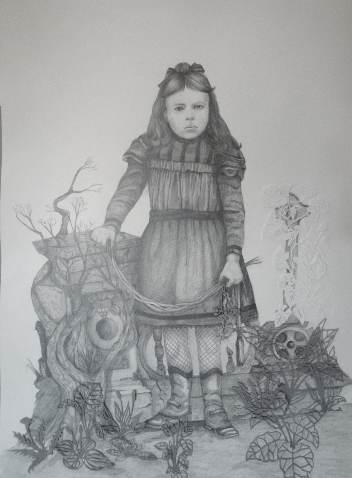 série "petite fleur de cimetière" inspirées de photos ancienne , cherhez le rat ! dessin au crayon et papier découpé au cutter . 50x70cm
