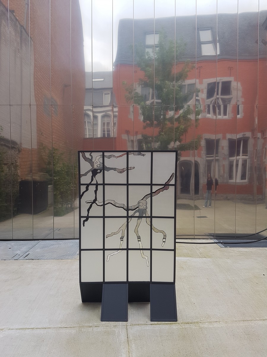 Sculpture en acier sur pied. Vitres sablées, motifs avec la technique de grisaille.