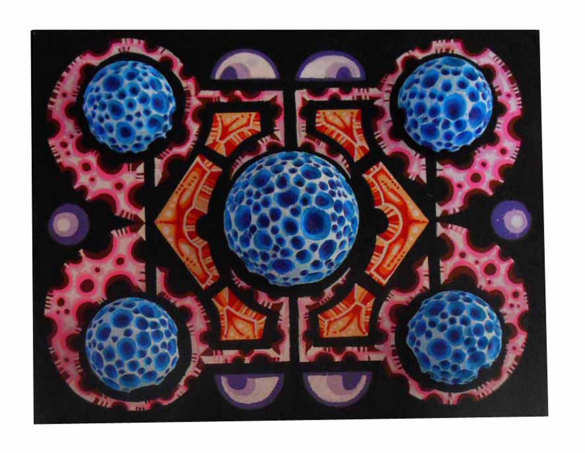 La petite toile/collage, "Les 5 Rondes"; réalisée à l'acrylique et la gouache, accompagné d'un collage de cinq demi-sphères de polystyrène travaillé au pyrograveur; représente par son graphisme et son titre la rondeur et la volupté et est un hommage à la femme et la féminité.