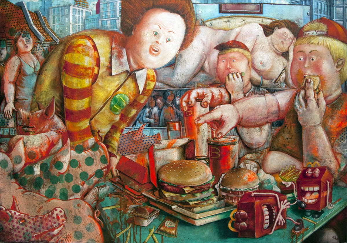 Tous les mots présents dans les œuvres, ainsi que les titres jouent avec les sens de l’image.  Ainsi « Mac Bo » peinture sur toile de 80x120, emprunte à Botero ses personnages obèses, mais ici  la bonhommie n’est qu’apparente. Rien n’est laissé au hasard dans cette scène efficace, composée méticuleusement sur le thème du repas au fast food. La surface est d’abord recouverte de ces couleurs fluorescentes utilisées dans les images promotionnelles pour attirer l’attention. L’absence d’ombre rend la lumière et les couleurs artificielles. Le premier plan prend la majorité de la surface de la toile pour représenter, sous l’œil du flûtiste de Hamelin, une table abondamment chargée en nourriture « happy meal » diabolique et des jeunes convives insouciants  et ignorants, tels Pinocchio, de l’inévitable métamorphose. Ce rabaissement de l’humain en animal  ou en objet, implacable destin des manipulations des proies, est récurrent dans l’œuvre d’Iskias. Il  signale l’urgence et la nécessité de réagir face aux situations critiques. Mais n’est-il pas déjà trop tard ? La surface de la toile présente un aspect granuleux et craquelé, comme si le tableau avait vieilli. L’interpellation actuelle de l’évolution de la situation est-elle déjà caduque ? Des trames ponctuées à la Roy Lichtenstein ont déjà commencé à passer au crible le tableau et jettent le désarroi sur l’œuvre.