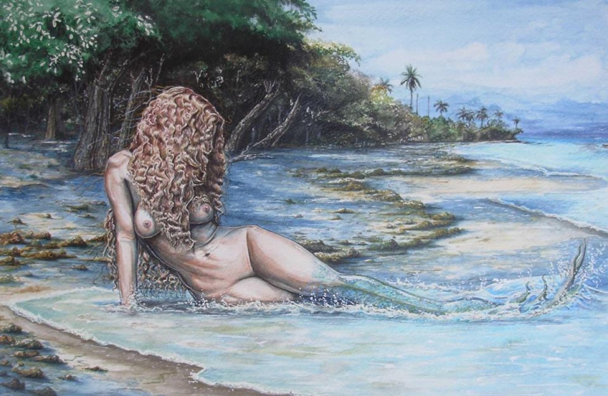 A mermaid sheds her tail to remain on land to spend her days with her mortal love. A watercolor that was donated to charity to provide money to educate the local children of the Bocas del Toro archipelago. Prints available at Imagekind under Jorgensenartworks.