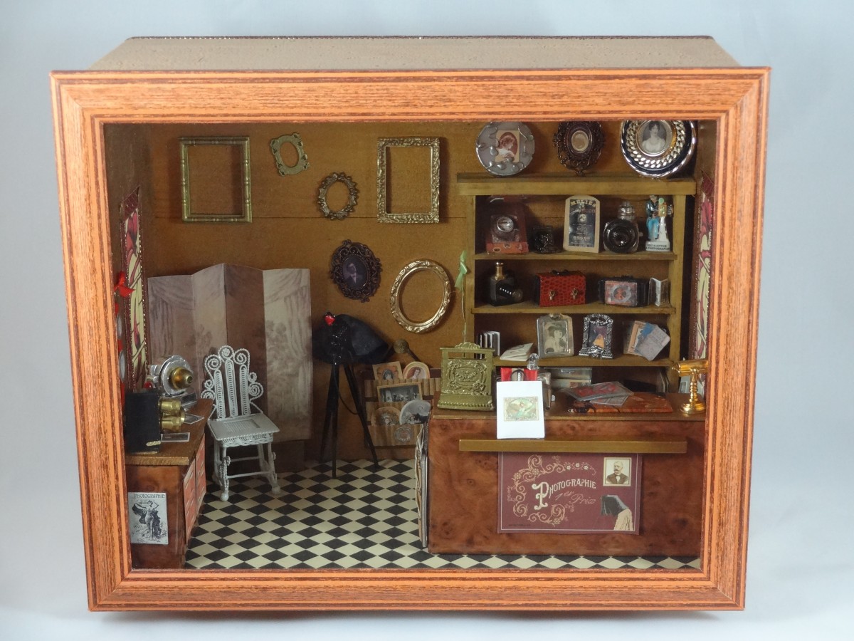 Vitrine miniature réalisée par moi-même, plus de 15 heures de travail ; la vitrine est présenté dans une caisse en bois. J'ai fabriqué le plus de petits objets possible. Ce modèle est unique.Je voulais représenter le corps de métier des photographe en 1900, j'aime beaucoup cette époque.