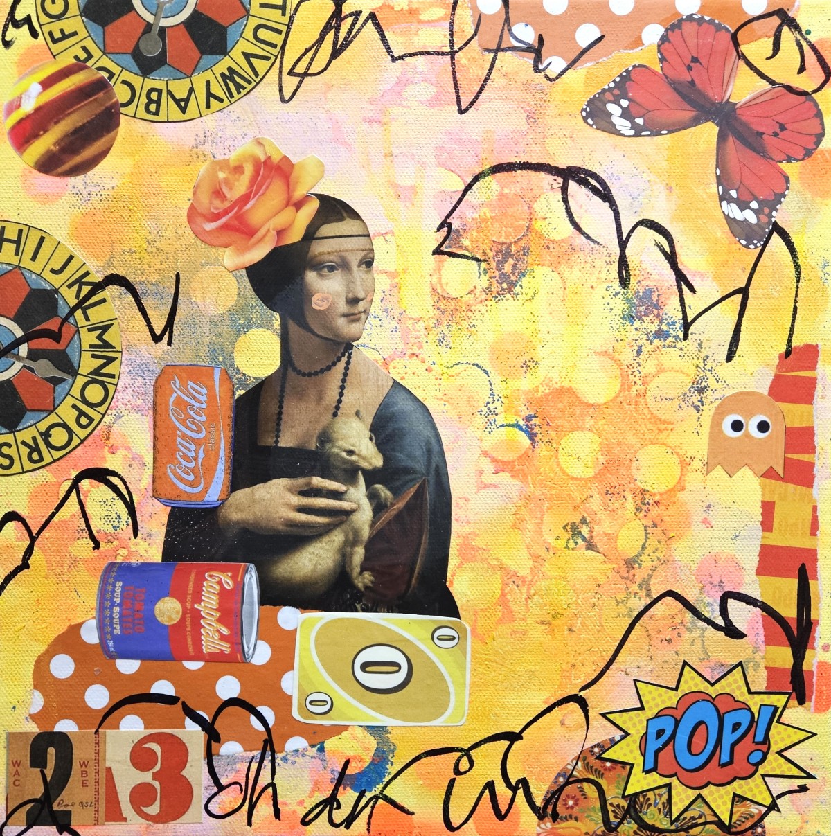 Pop art homage to Da Vinci. All signature squares are 12x12 inches, collage and mixed media on stretched canvas, with edges painted black, wire on back, ready to hang.
