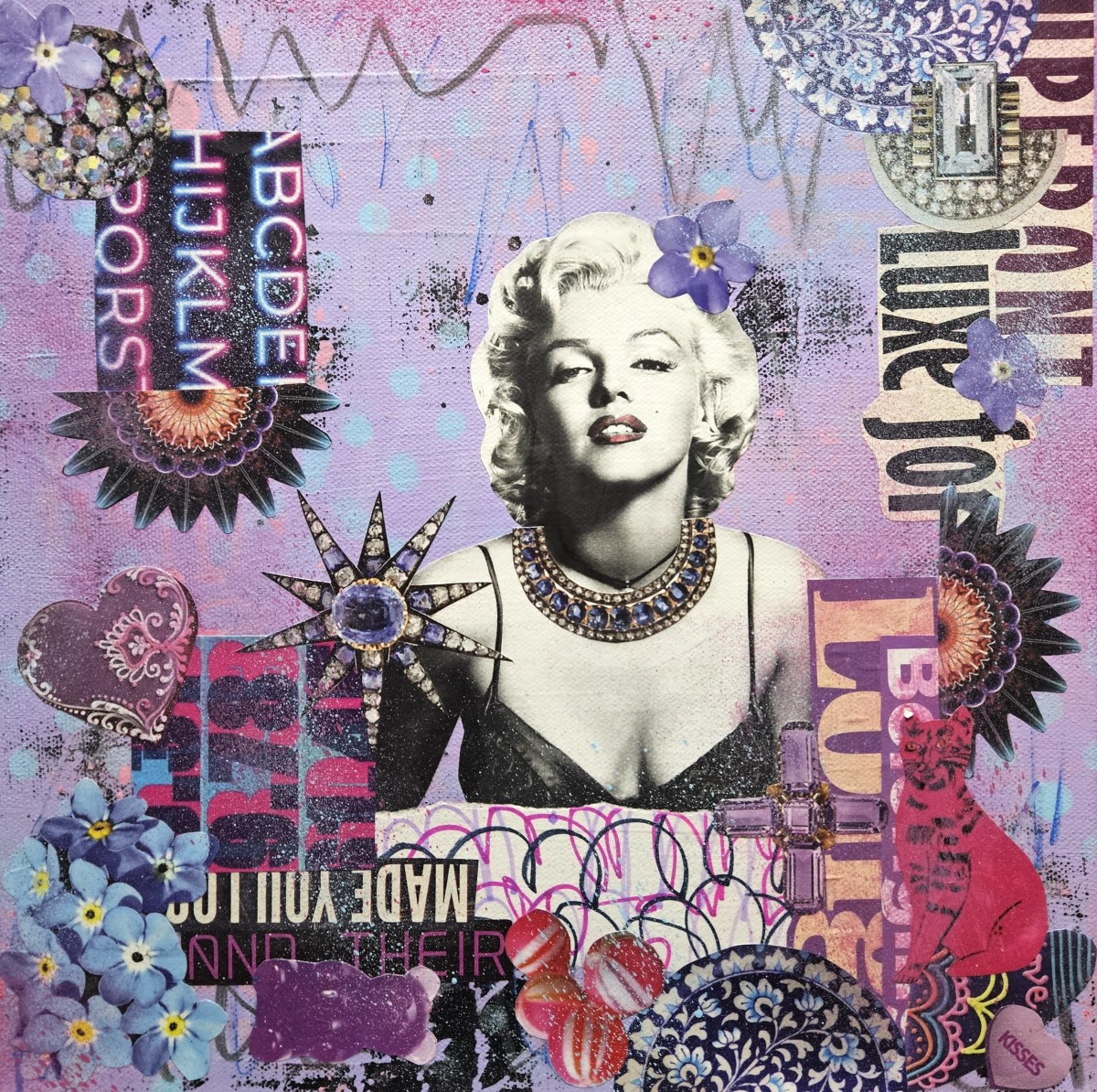 Tribute to Marilyn Monroe. All signature squares are 12x12 inches, collage and mixed media on stretched canvas, with edges painted black, wire on back, ready to hang.