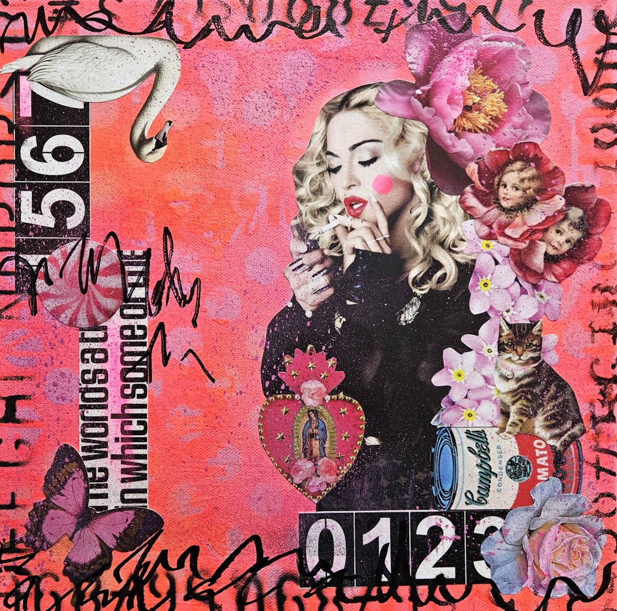 Tribute to Madonna. All signature squares are 12x12 inches, collage and mixed media on stretched canvas, with edges painted black, wire on back, ready to hang.