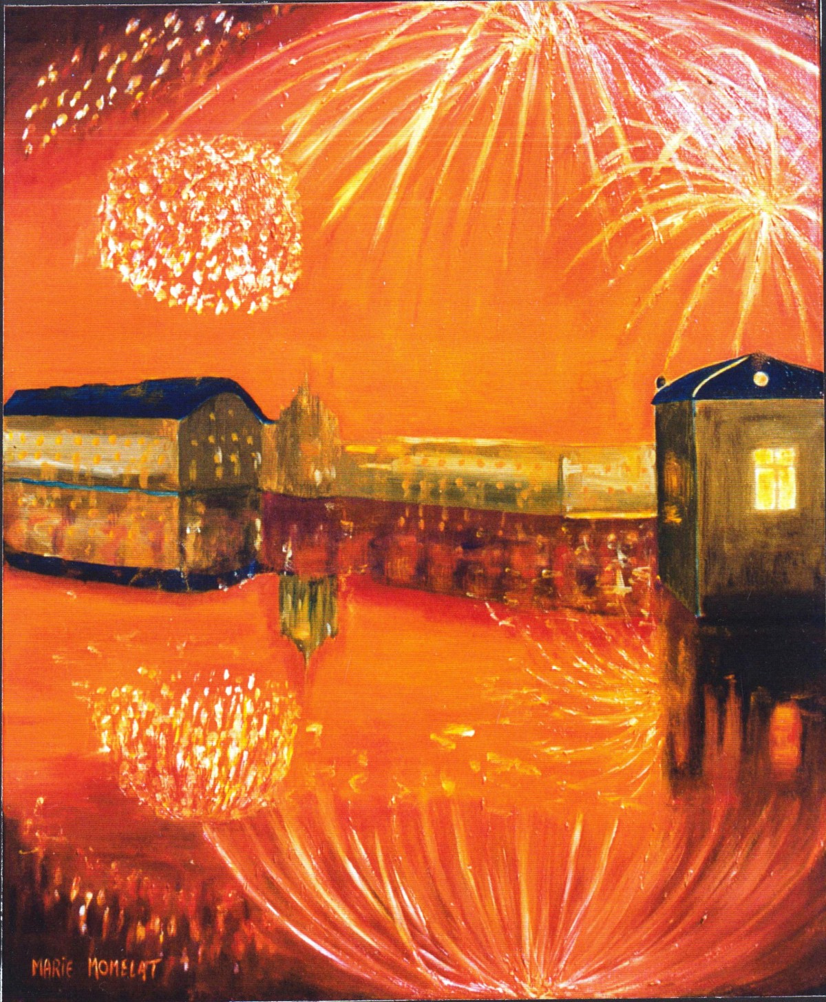 huile sur toile au pinceau : tableau original - fête au Château de Chantilly : les feux d'Artifice sur l'eau ;