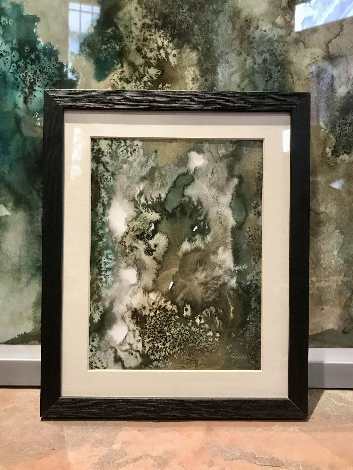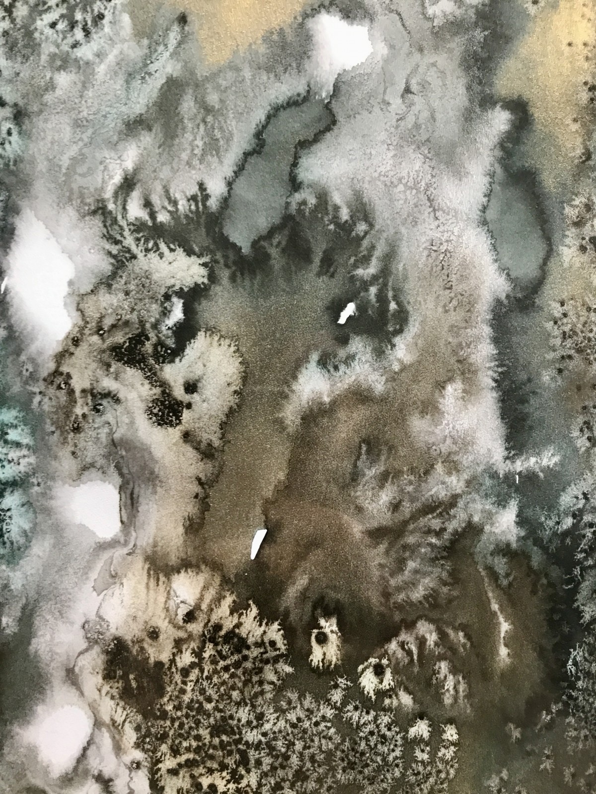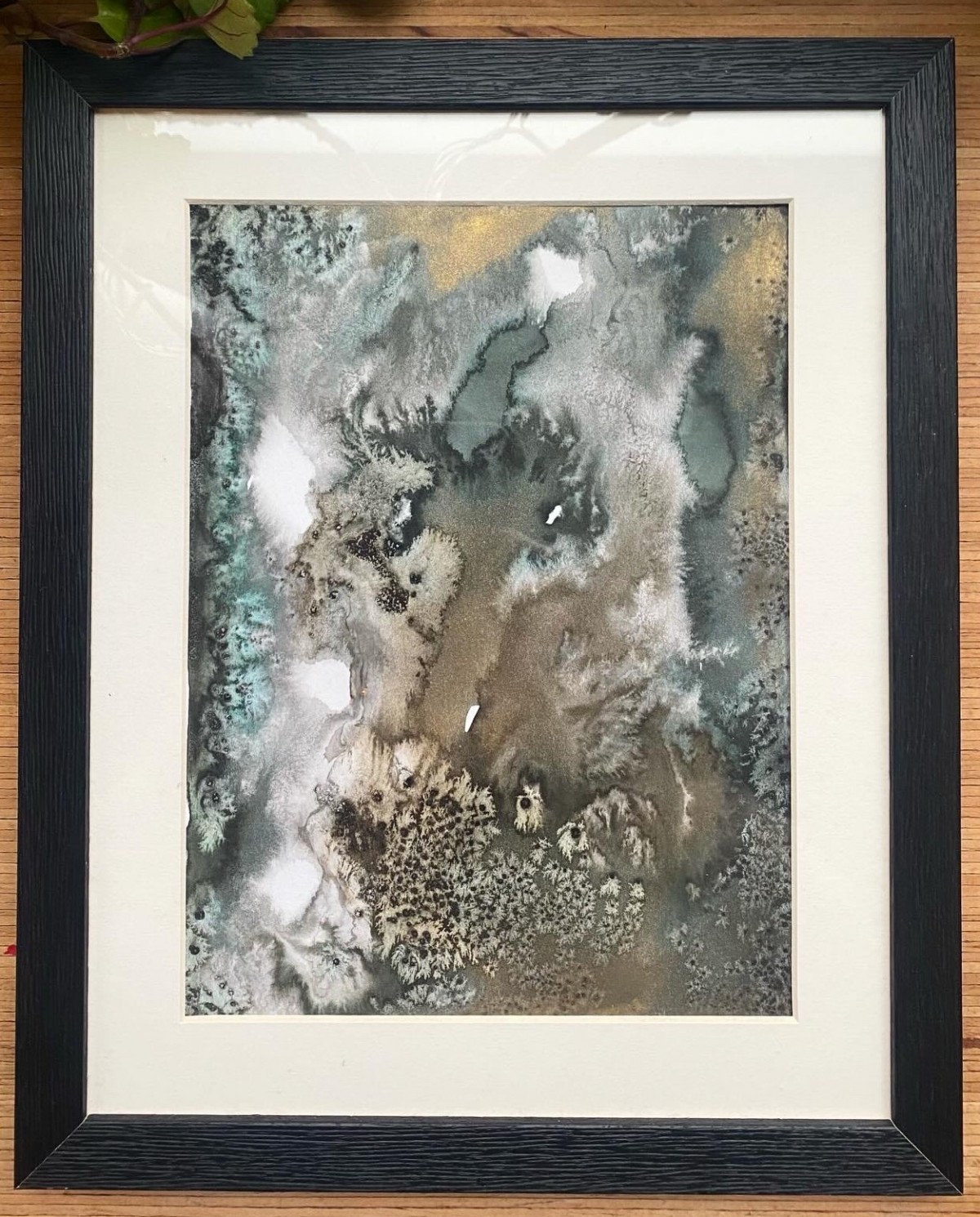 Peinture à l'encre Sumi noire, à l'encre colorée bleue, au brou de noix et à l'encre dorée, sur papier 200g.