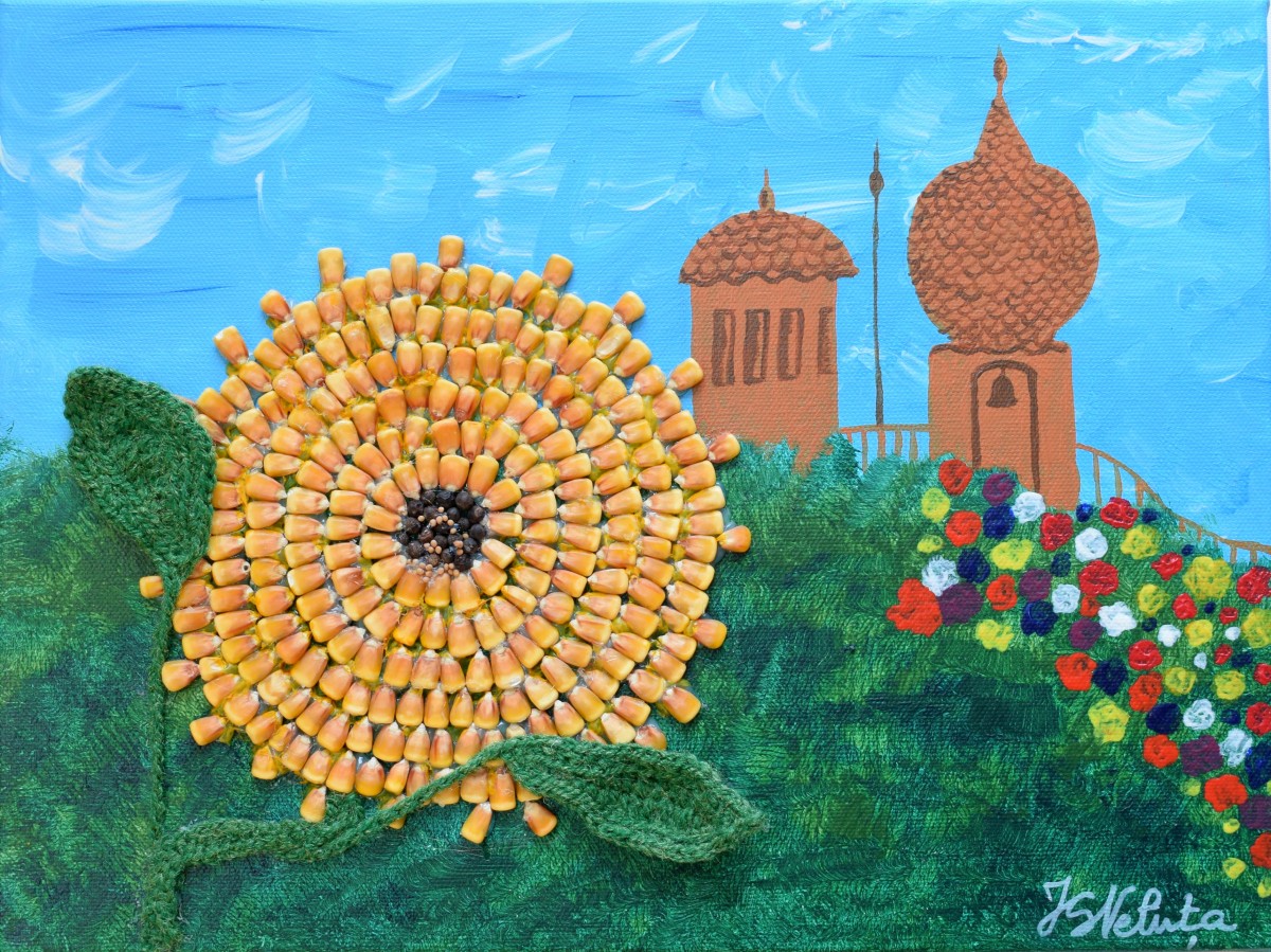 Acrylic canvas painting with applications of fibers and seeds representing the image of a minaret in a sunny day.