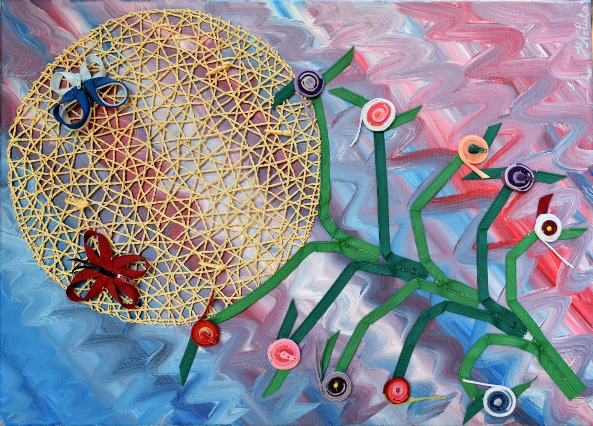 An useful painting made with recycled applications of zippers, textiles and fibers with an wide area of braided macrame that make it useful for jewelries.
