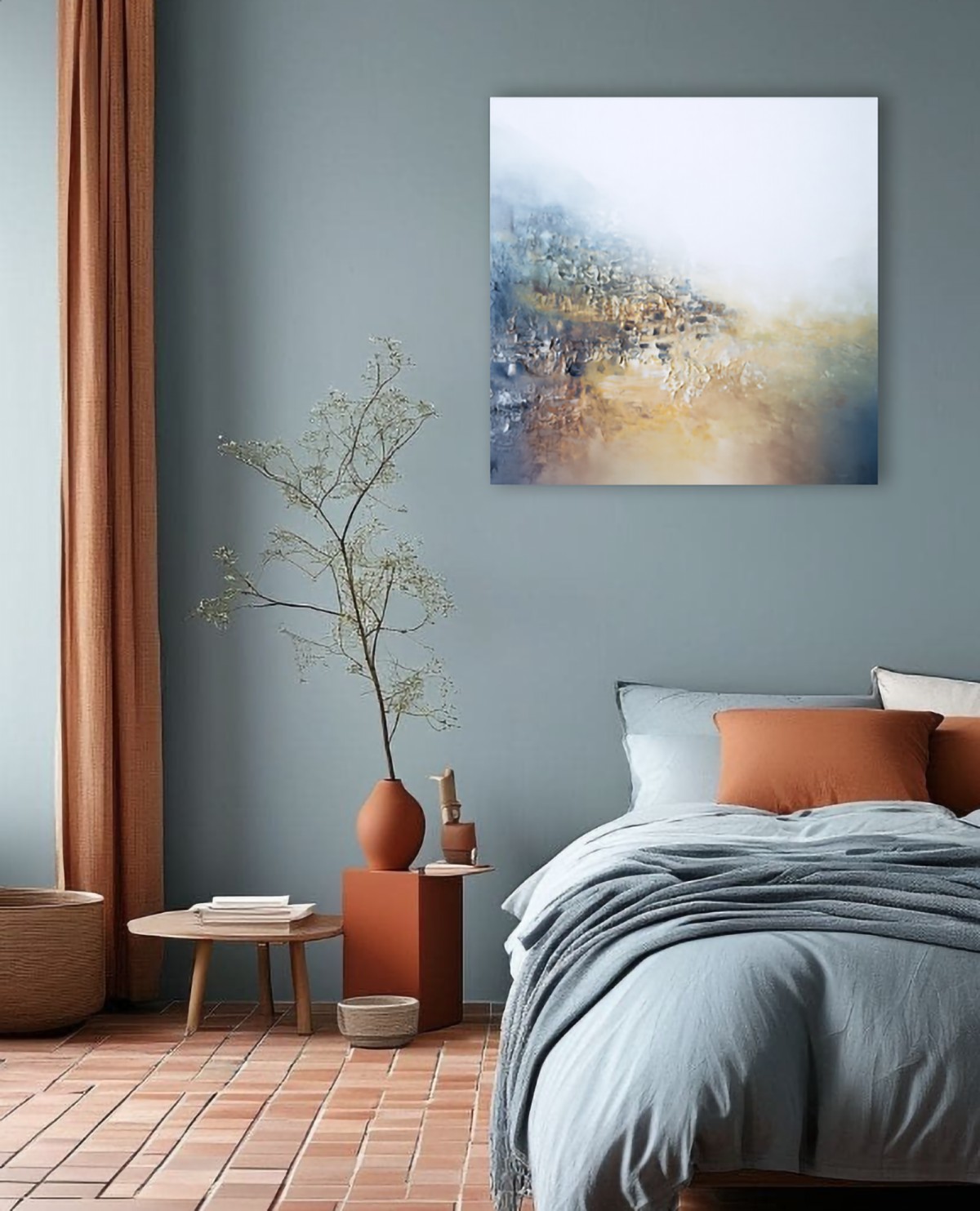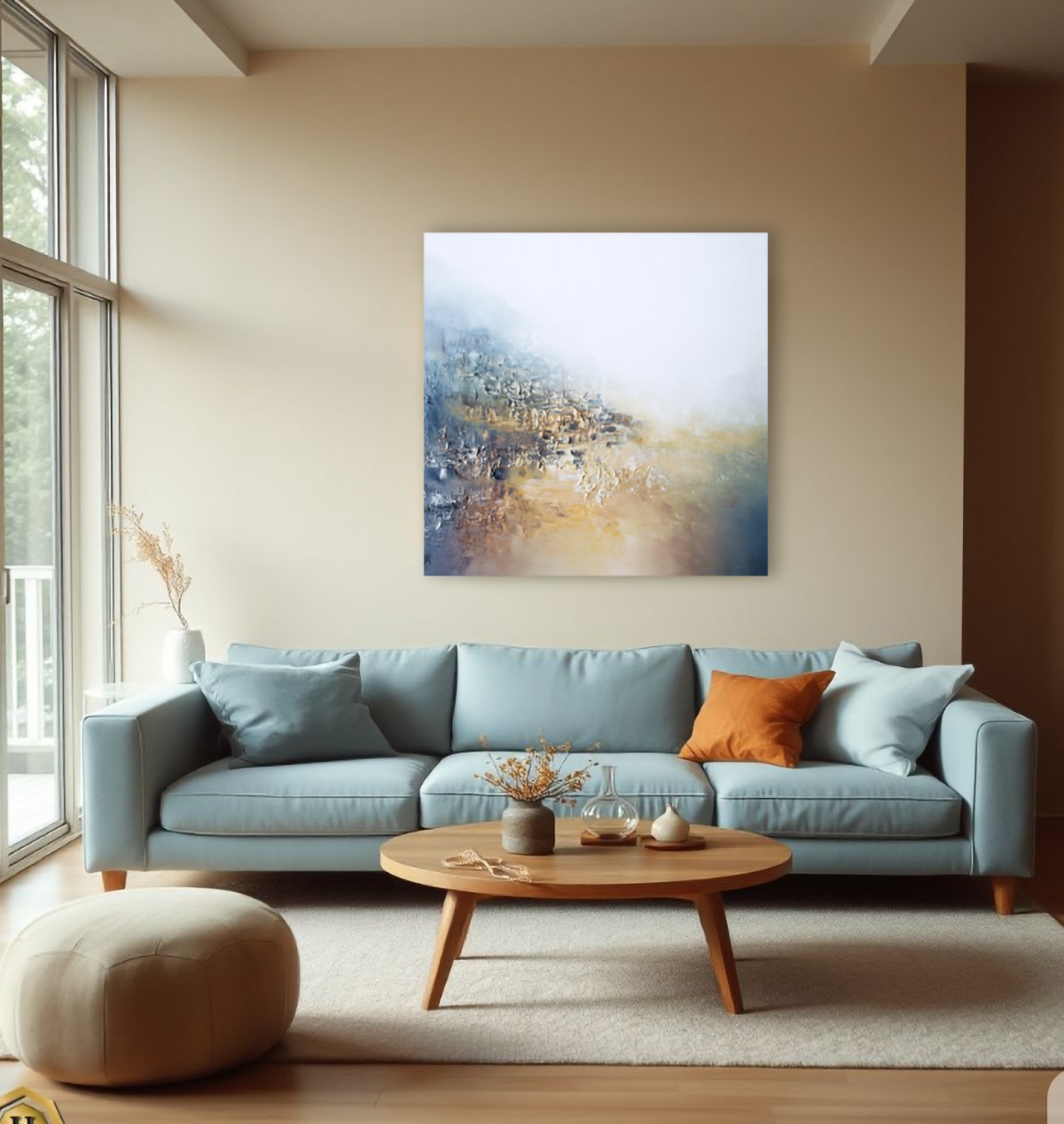 The work evokes a sense of silence after a long journey—as if space is gradually remembering itself. The surface is vibrant and textured, begging to be examined closely. The work blends soft blue, warm sand, and white tones. The colors blend into one another like mist over the earth. There are no sharp boundaries—everything breathes and connects. The artist conveys a sense of peace and trust in life.