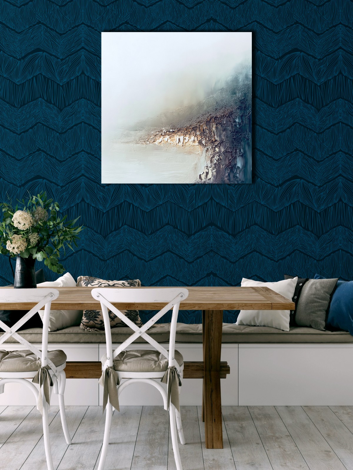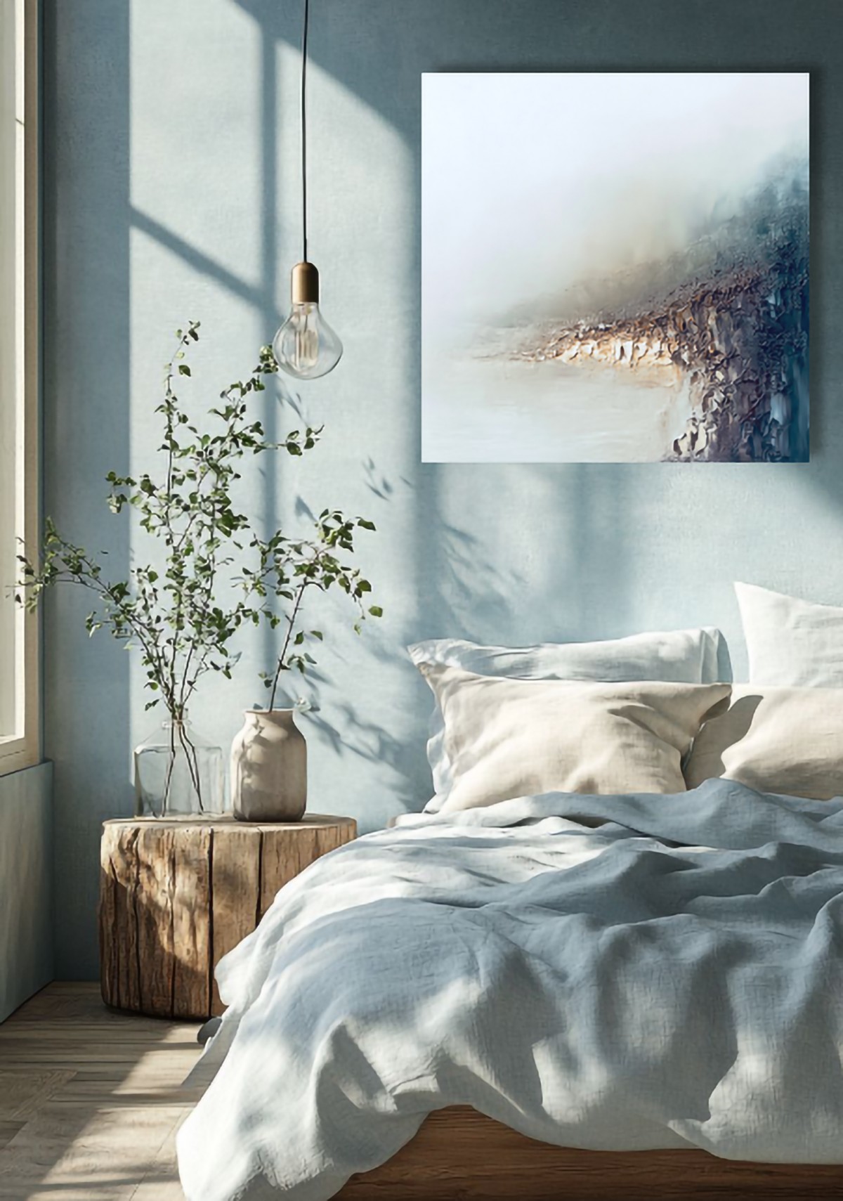 The work unfolds on the subtle line of contact between the dense and the ephemeral. Textured, almost stone-like areas seem to emerge from a light haze, forming a relief that has not yet become a landscape, but has already ceased to be an abstraction. The space seems simultaneously close and inaccessible: the viewer seems to stand at the edge, watching as form slowly emerges from the void. The painting conveys a state of anticipation, in which silence is filled with inner tension and possibility.