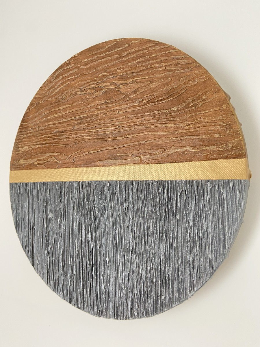At the bottom of the circle, a soft shade of gray, extends like a liquid mirror. This gray, fresh and fluid, contrasts with the rigidity of the wood and the gold line, bringing a feeling of calm and movement. The circle, while closed, seems to suggest a continuous and perpetually vibrating energy.