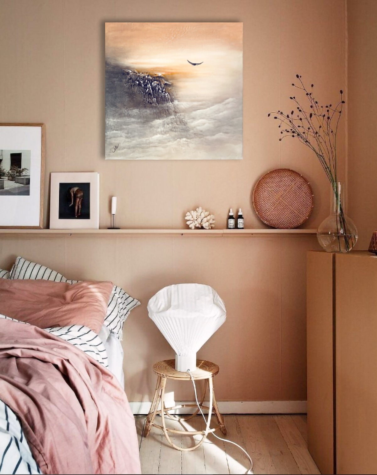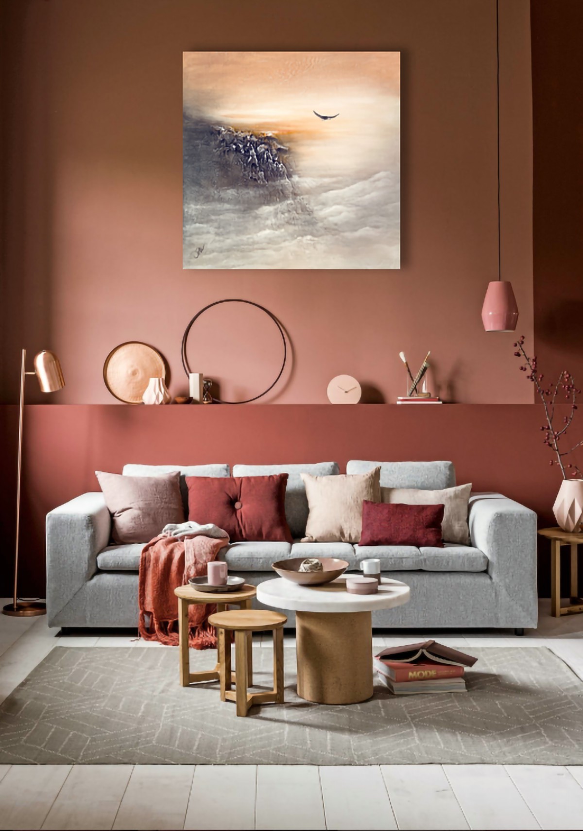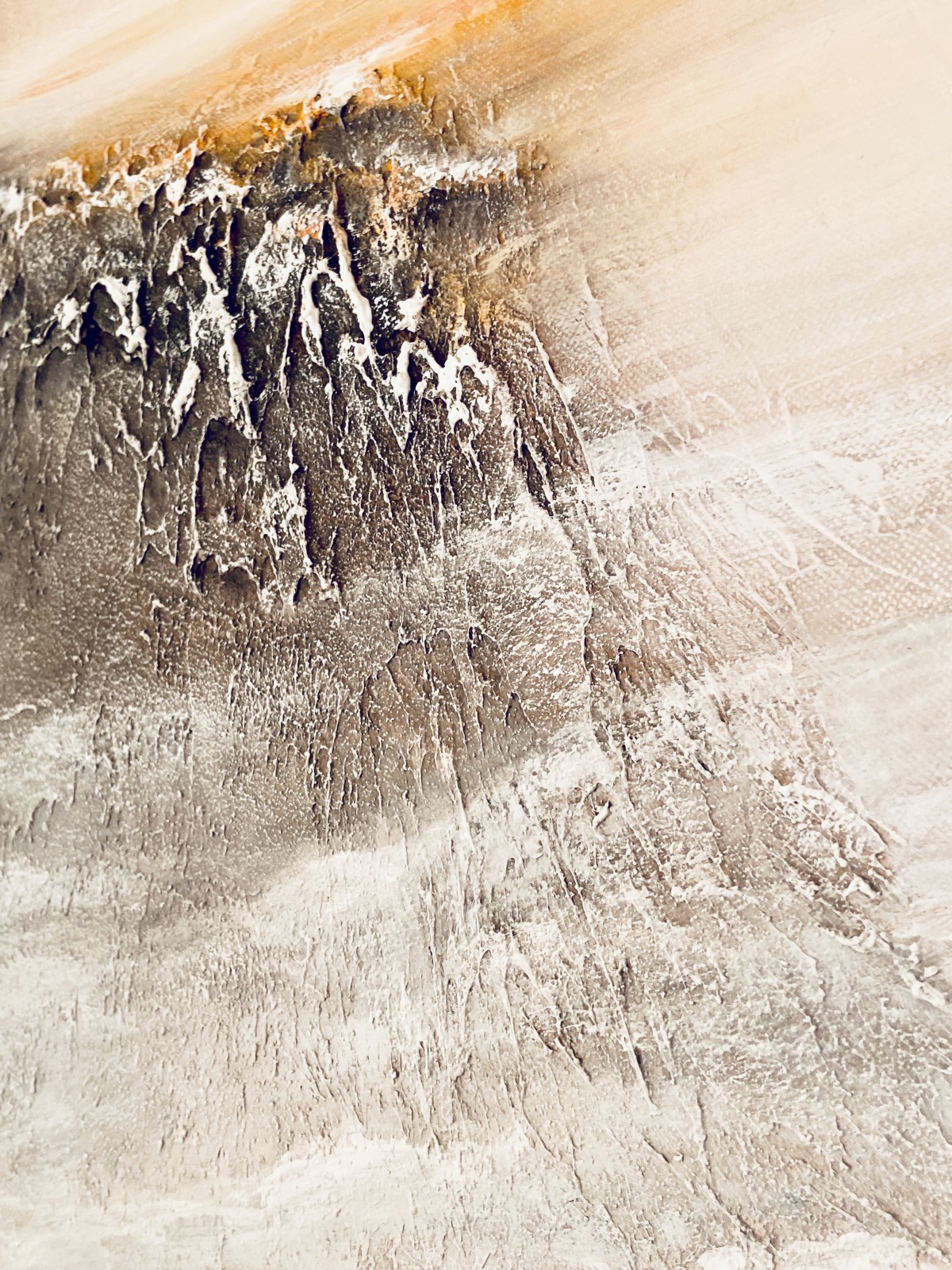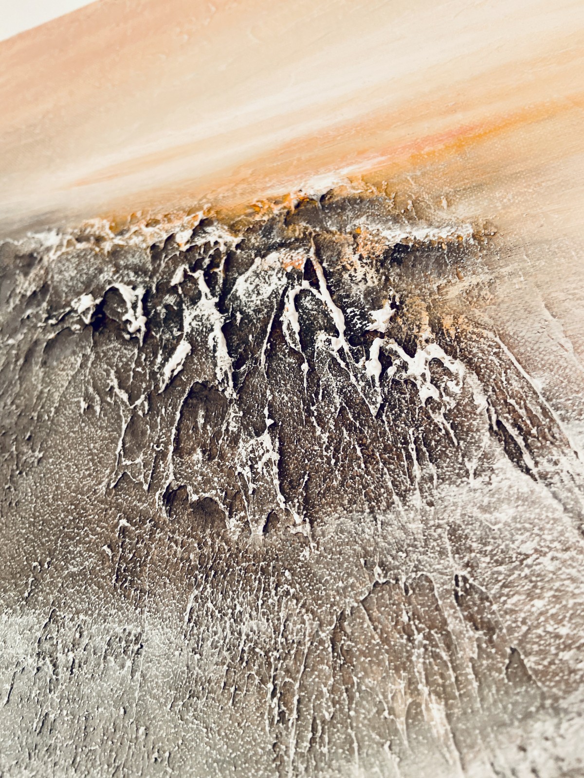 Structural paste is applied to a 50cm x 50cm canvas, then acrylic paint, and a protective layer of varnish completes the painting.