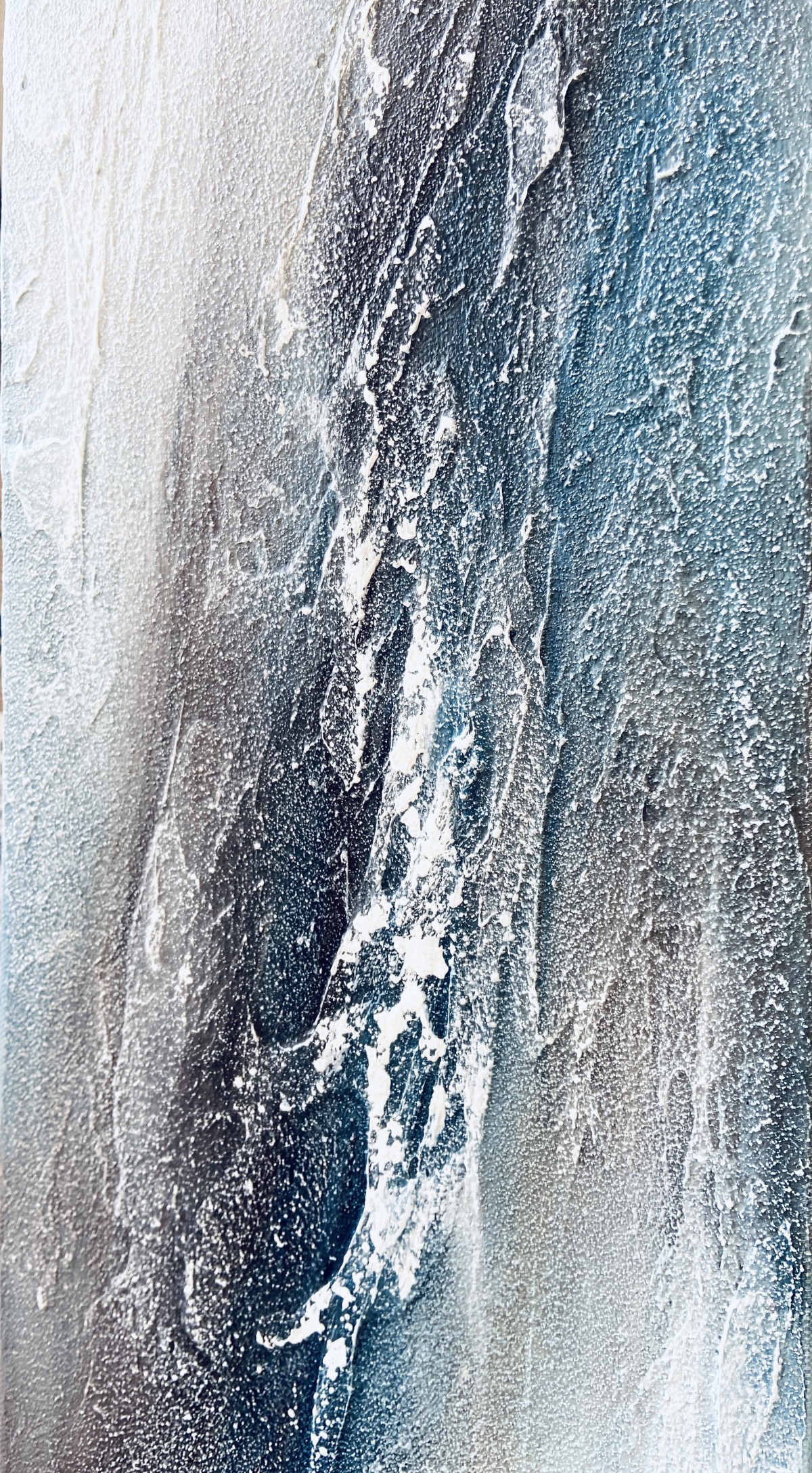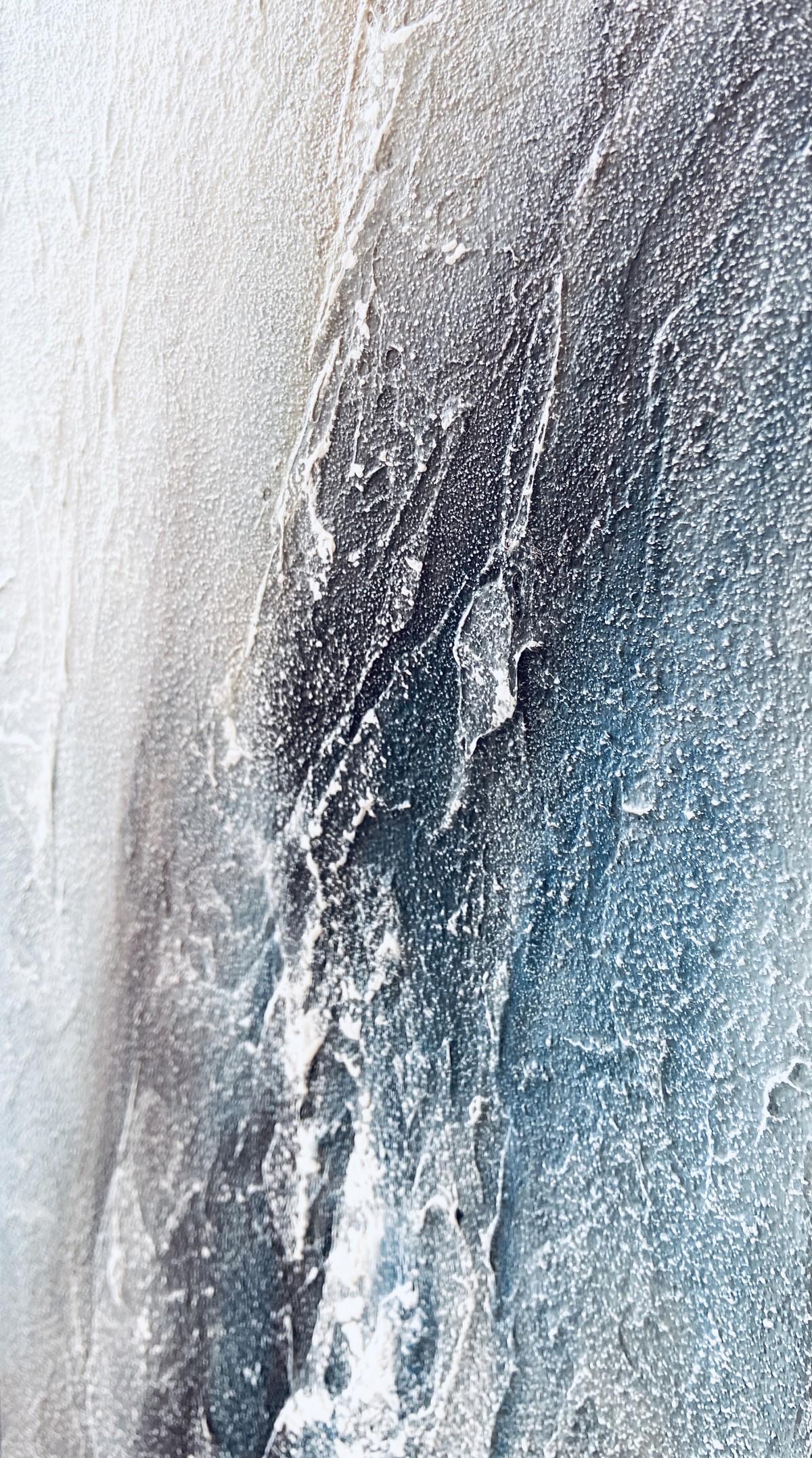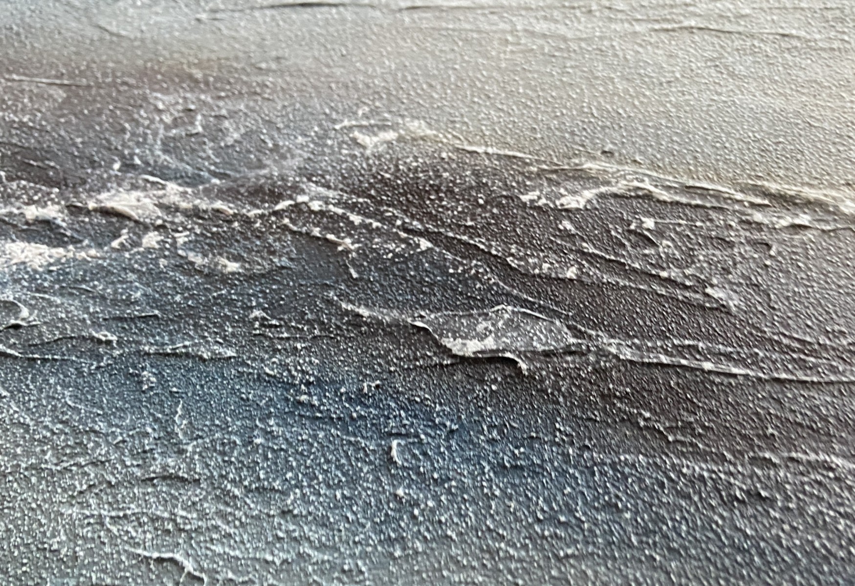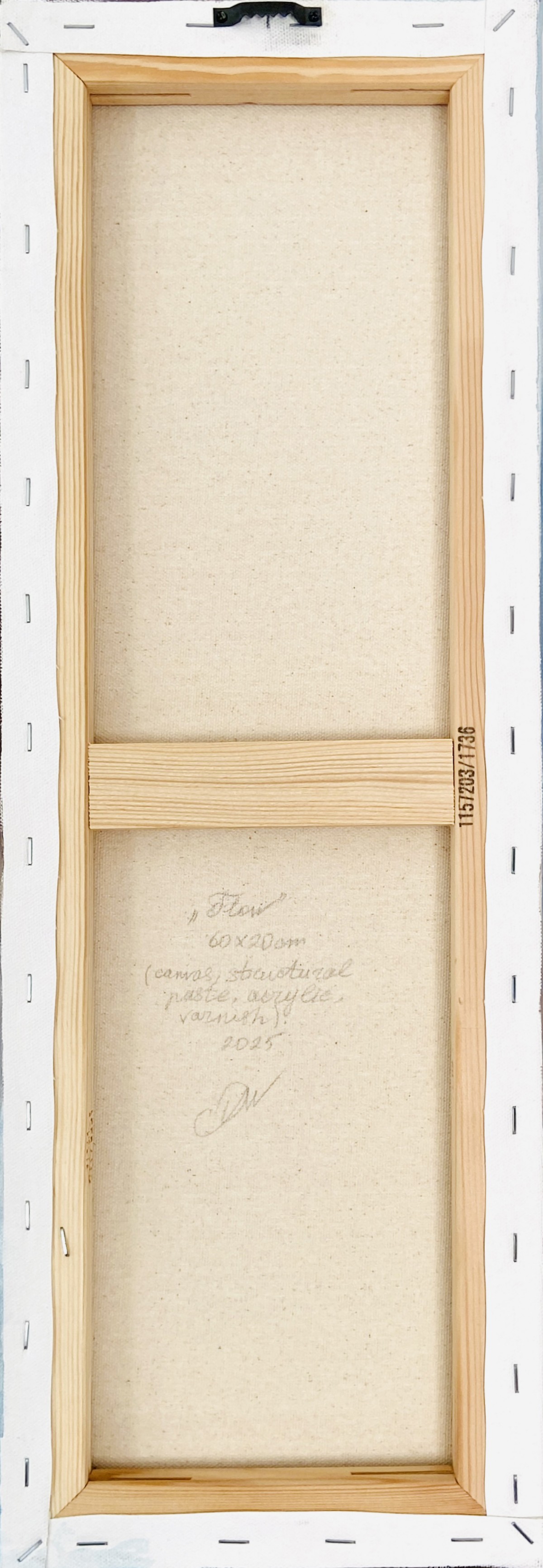 The painting is executed in acrylic with three-dimensional strokes of textured paste. Soft transitions of gray, blue, and beige create a sense of movement. The texture resembles the traces of water left by a stream on a stone. The light areas seem to illuminate the path along which the energy flows. The dark lines add depth and tranquility. The artist conveys a feeling of clarity, when thoughts become transparent. There is a moment of silence here, followed by inspiration. The work creates an atmosphere of purification and gentle renewal.