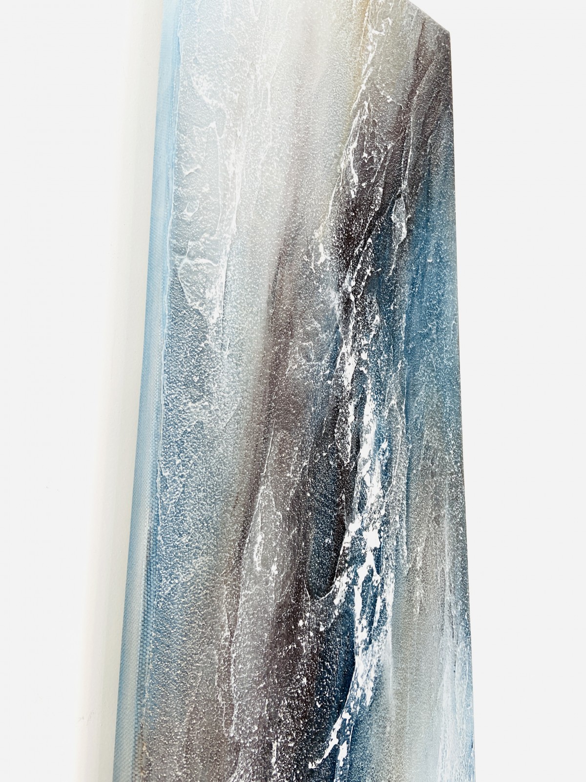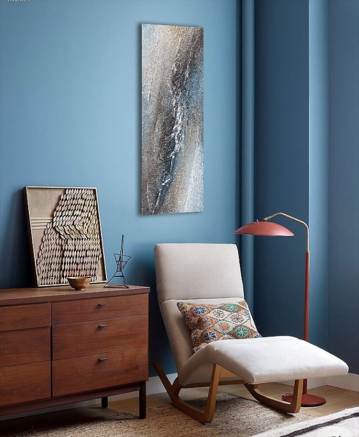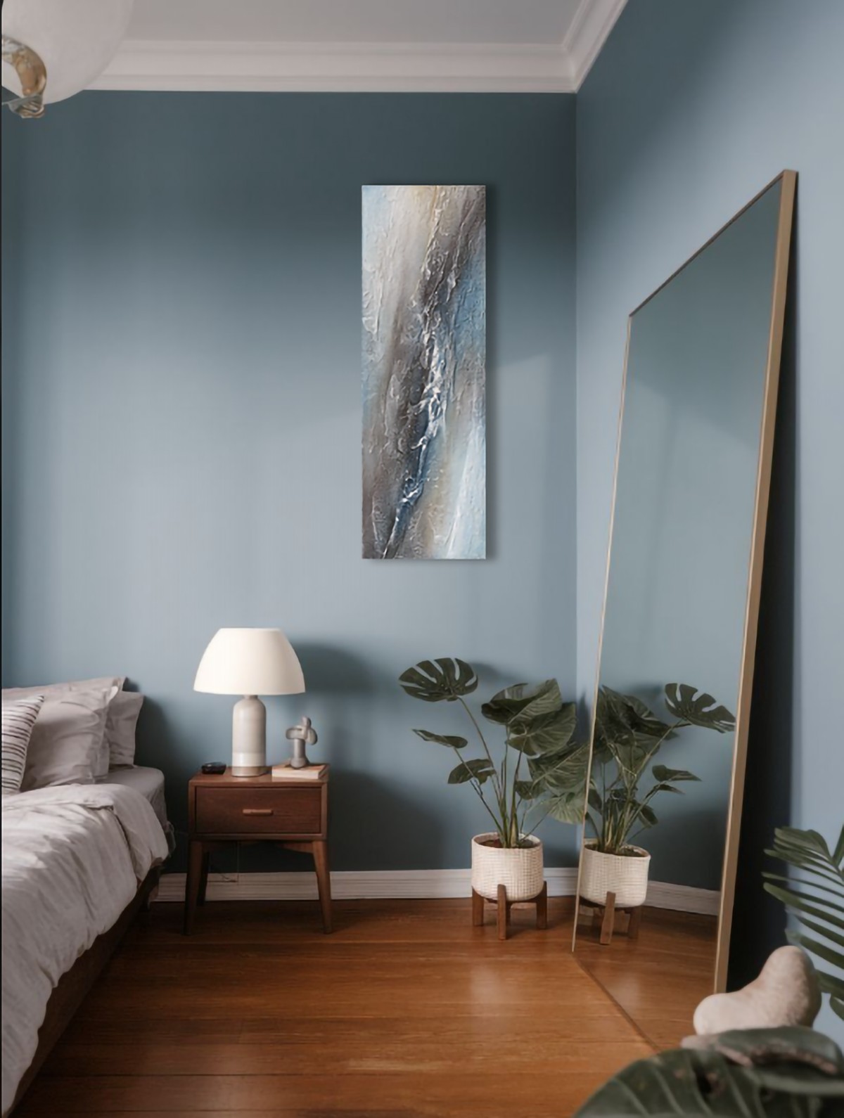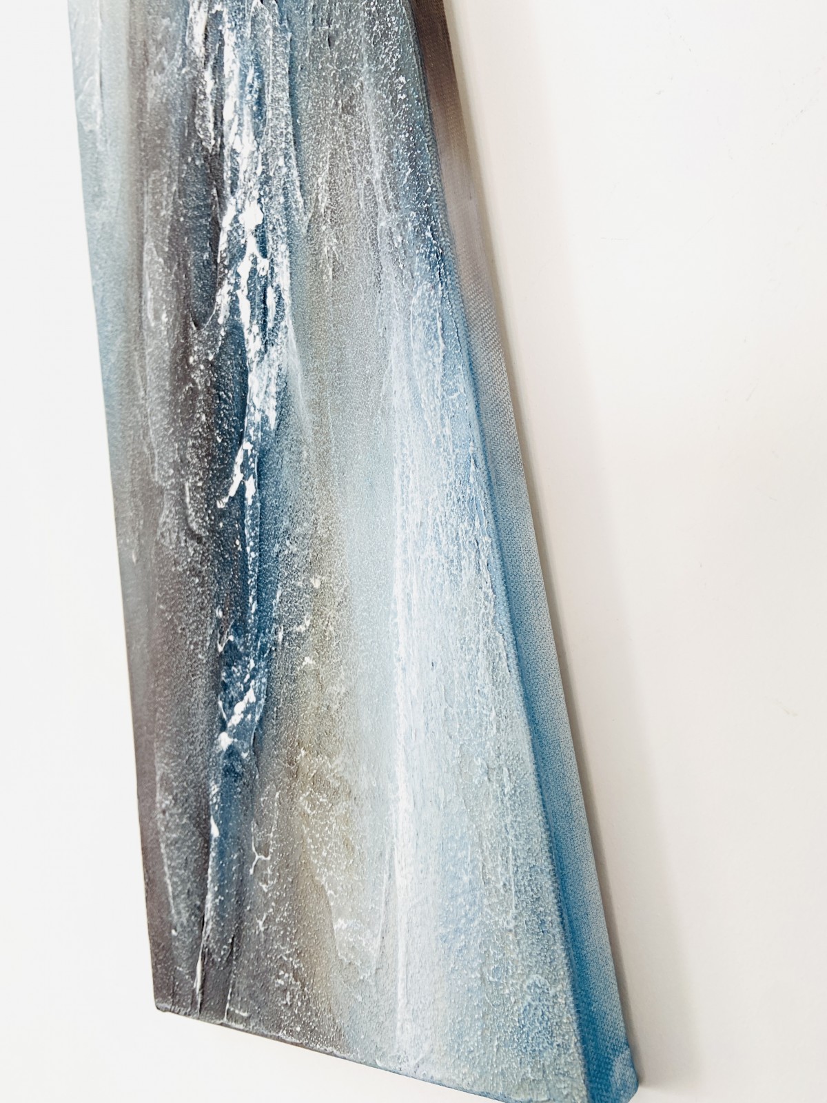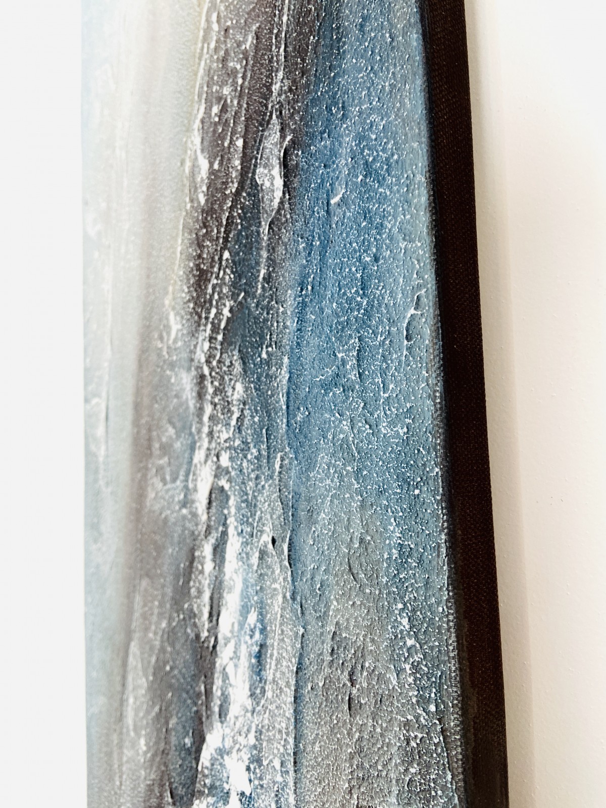 The painting is executed in acrylic with three-dimensional strokes of textured paste. Soft transitions of gray, blue, and beige create a sense of movement. The texture resembles the traces of water left by a stream on a stone. The light areas seem to illuminate the path along which the energy flows. The dark lines add depth and tranquility. The artist conveys a feeling of clarity, when thoughts become transparent. There is a moment of silence here, followed by inspiration. The work creates an atmosphere of purification and gentle renewal.