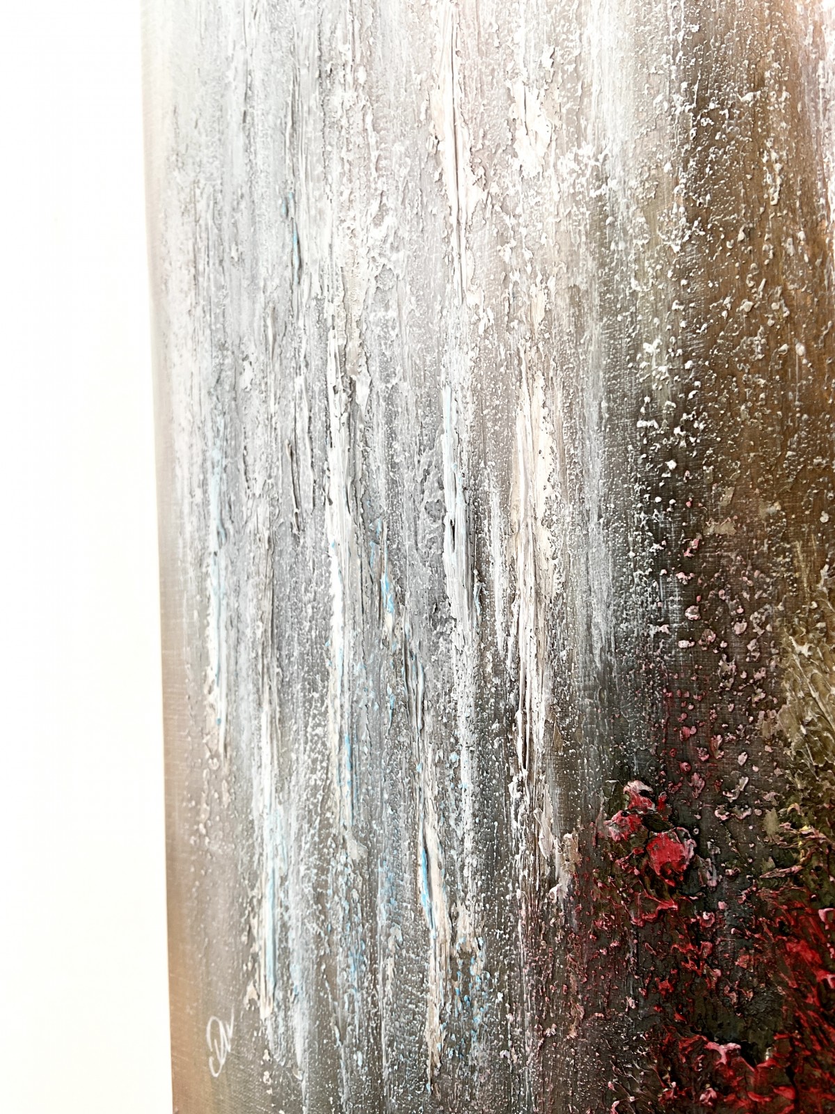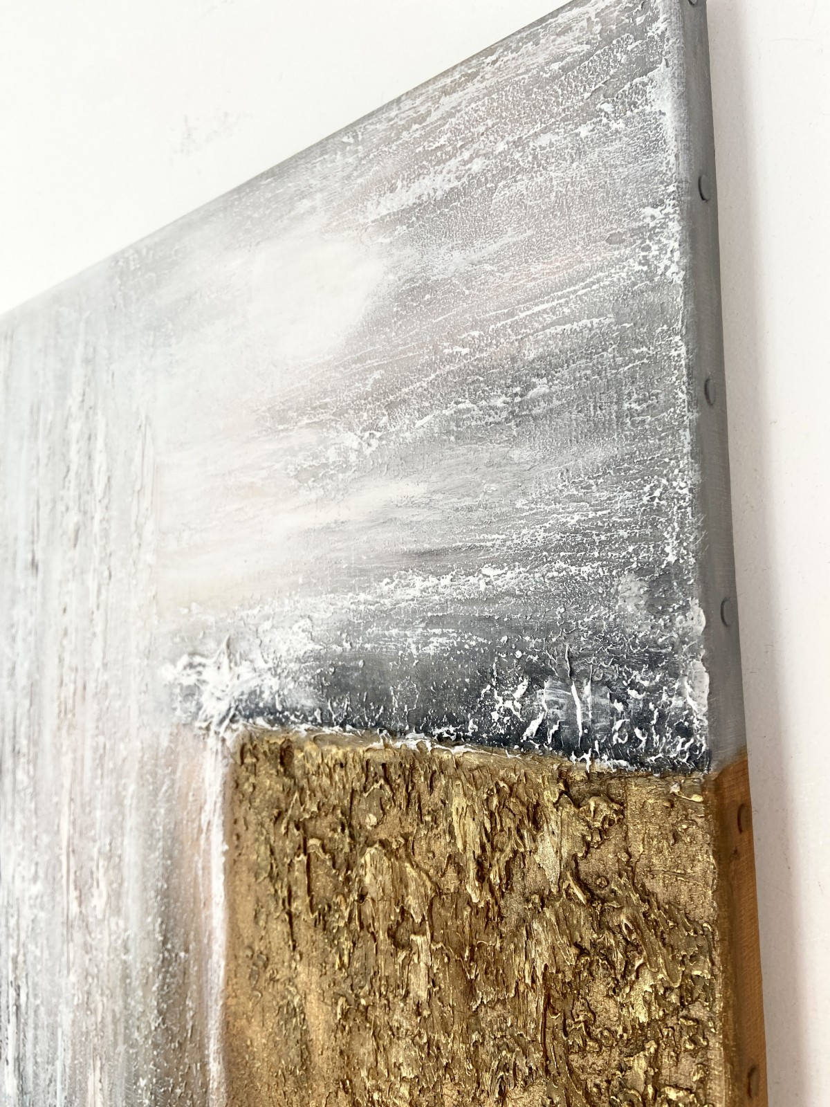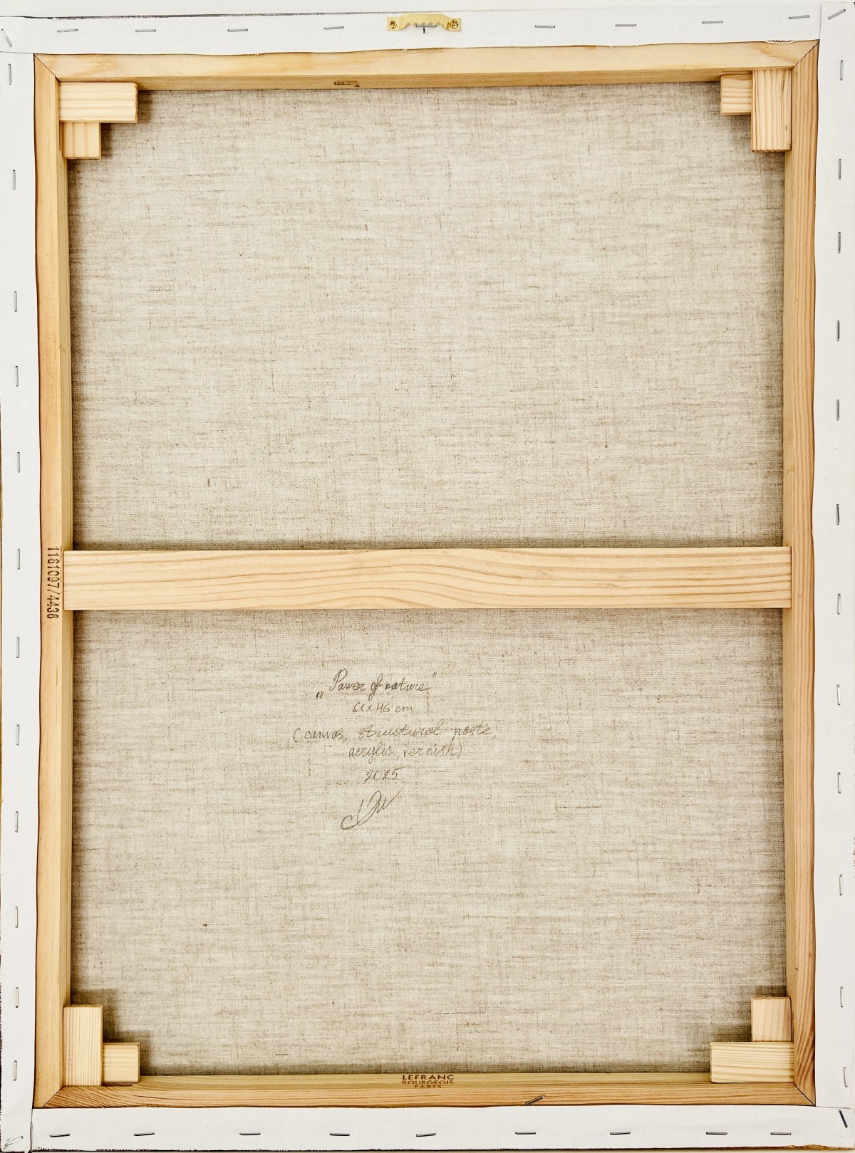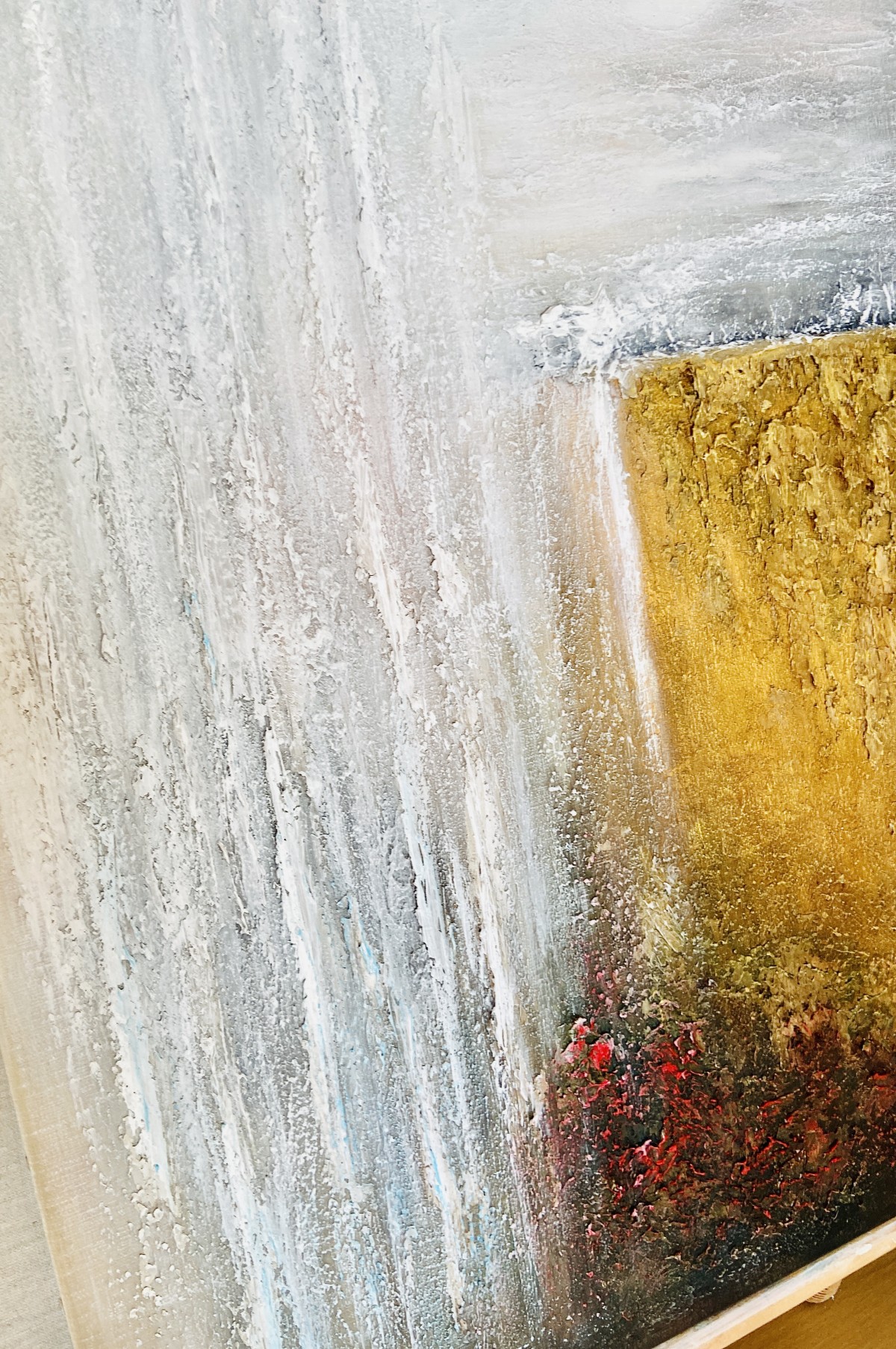 Structural paste is applied to a 61cm x 46cm canvas, then acrylic paint, and a protective layer of varnish completes the painting.