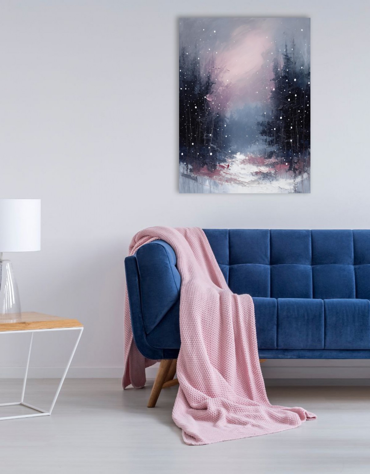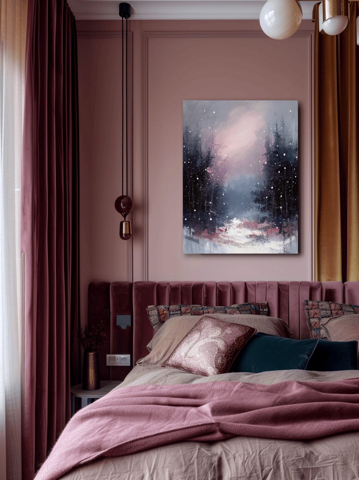 The painting shows a winter forest in a gentle snowfall. Dark trees stand on both sides, forming a kind of gate to the unknown. Behind them opens a bright misty distance with a soft pink glow. Snow falls slowly, creating a feeling of silence and peace. Warm pink tones on the ground softly contrast with the cold around. It feels like ahead lies a place where the shadows end. The light beyond the forest looks tender and promising. The painting conveys a sense of transition — from darkness to gentle light. The whole scene is filled with calm and a touch of dreaminess. It is a path to where shadows turn into light beyond the horizon.