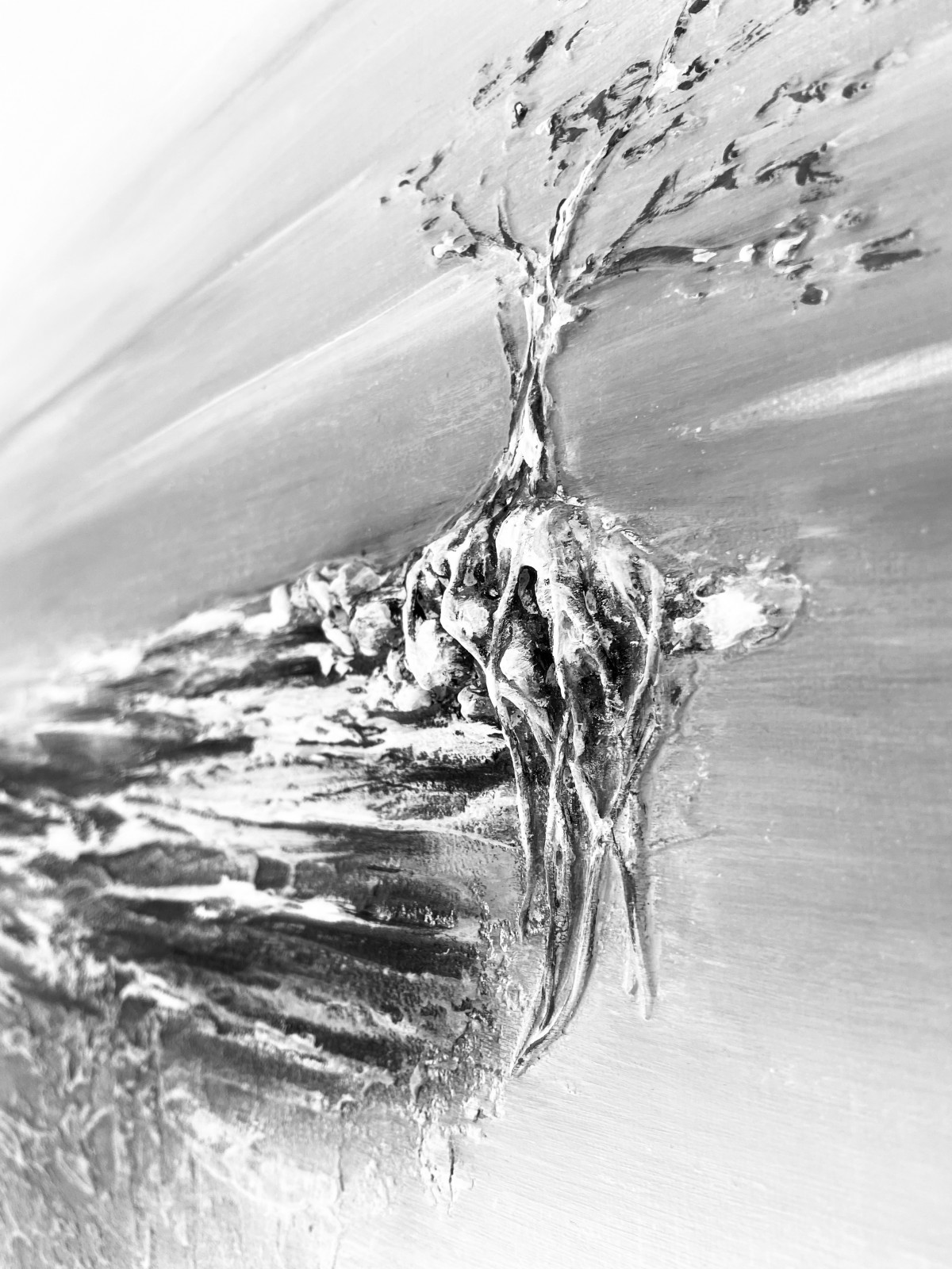The black-and-white palette enhances the sense of calm and depth. The texture gives the surface a feeling of something real and alive. This is not just a landscape — it's a state of being.