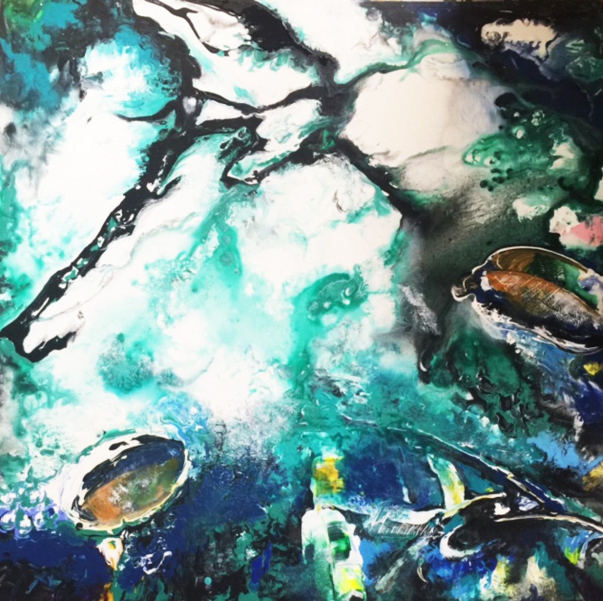 This painting is a reflection of two branches of the same tree in water dancing together and moving towards light.The symbolism here is of branches representing different races and cultures dancing together to represent the true spirit of humanity.