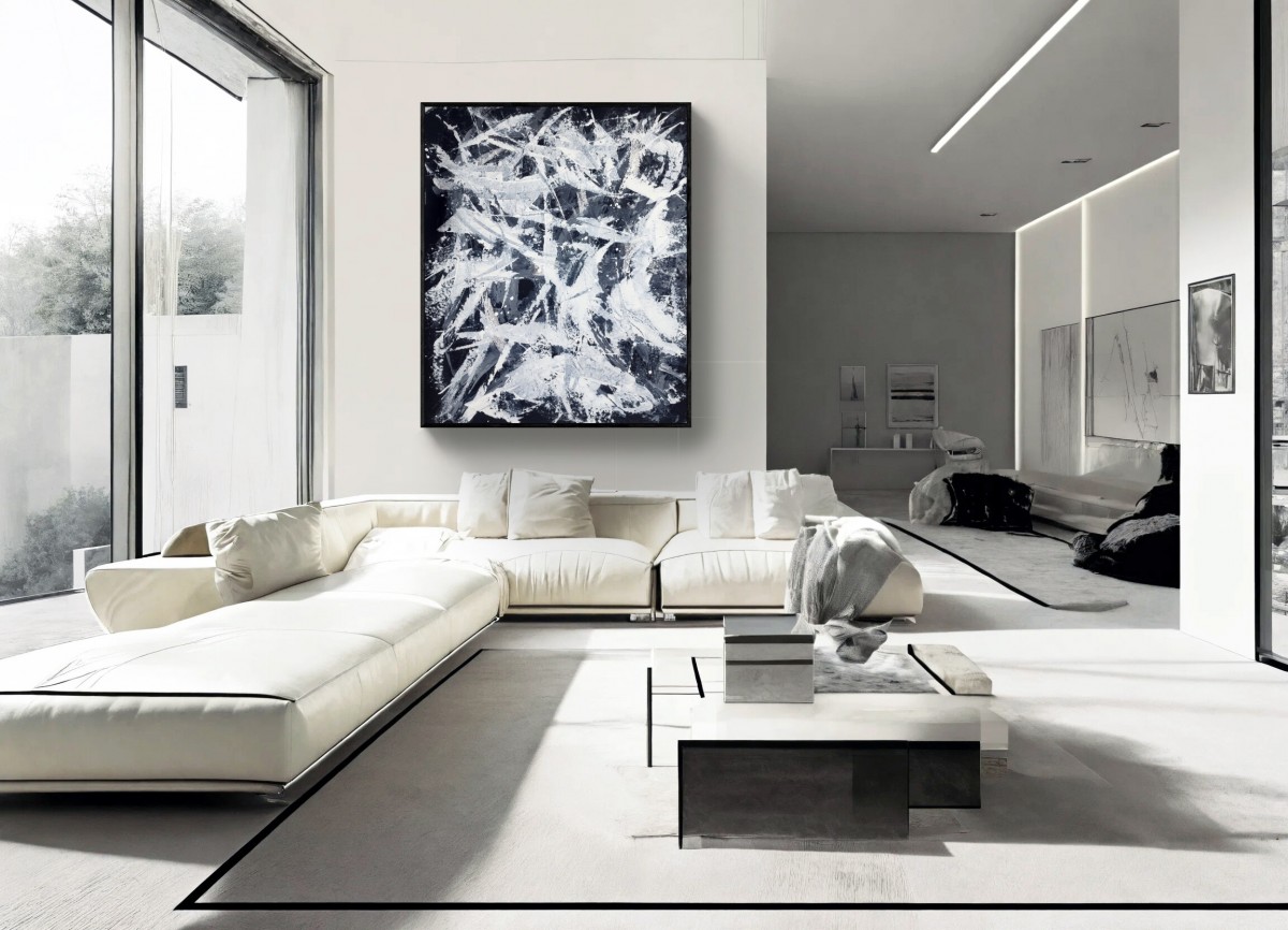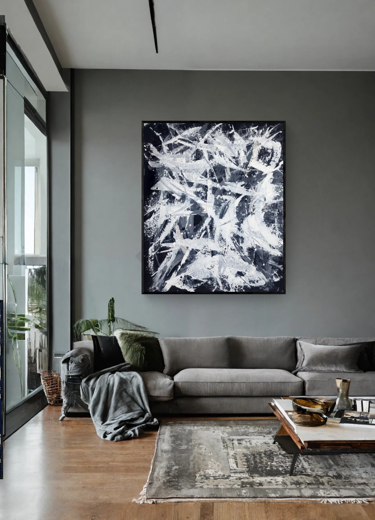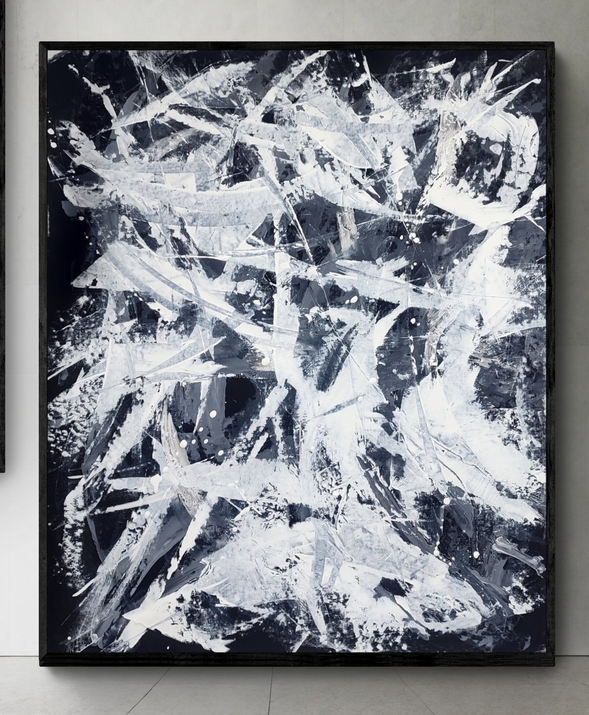 Peinture abstraite de format 100/81 cm , dans la mouvance de l’expressionnisme abstrait de Pollock et de l'action peinture ou c'est le geste qui créé l’œuvre, le résultat est vivant et dynamique . Du blanc en surface sur un fond de dégradé de gris.
