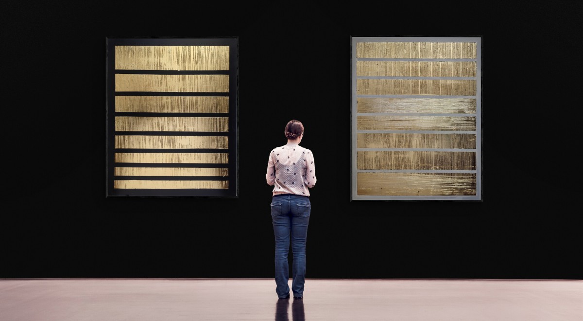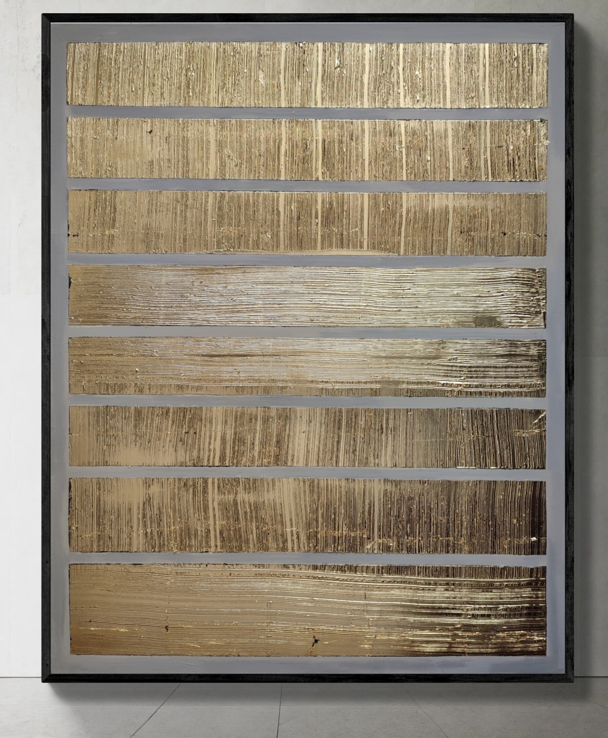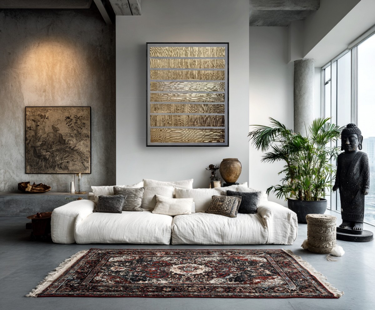 Feuille d'or sur enduit en relief, peinture acrylique, pour un tableau chic et moderne , dans des teintes douces.