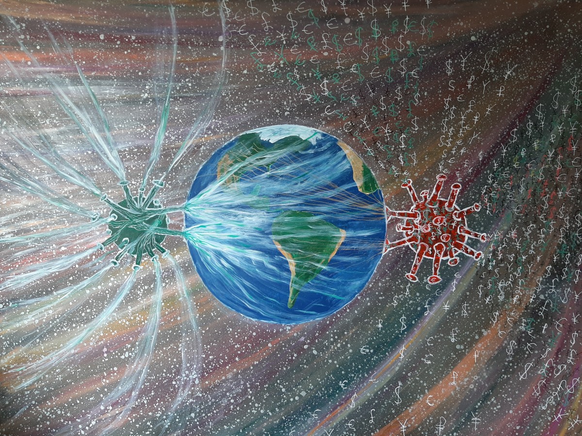 This acrylic on canvas painting describes the coronavirus 2020 clearing away the money and the pollution on our planet.