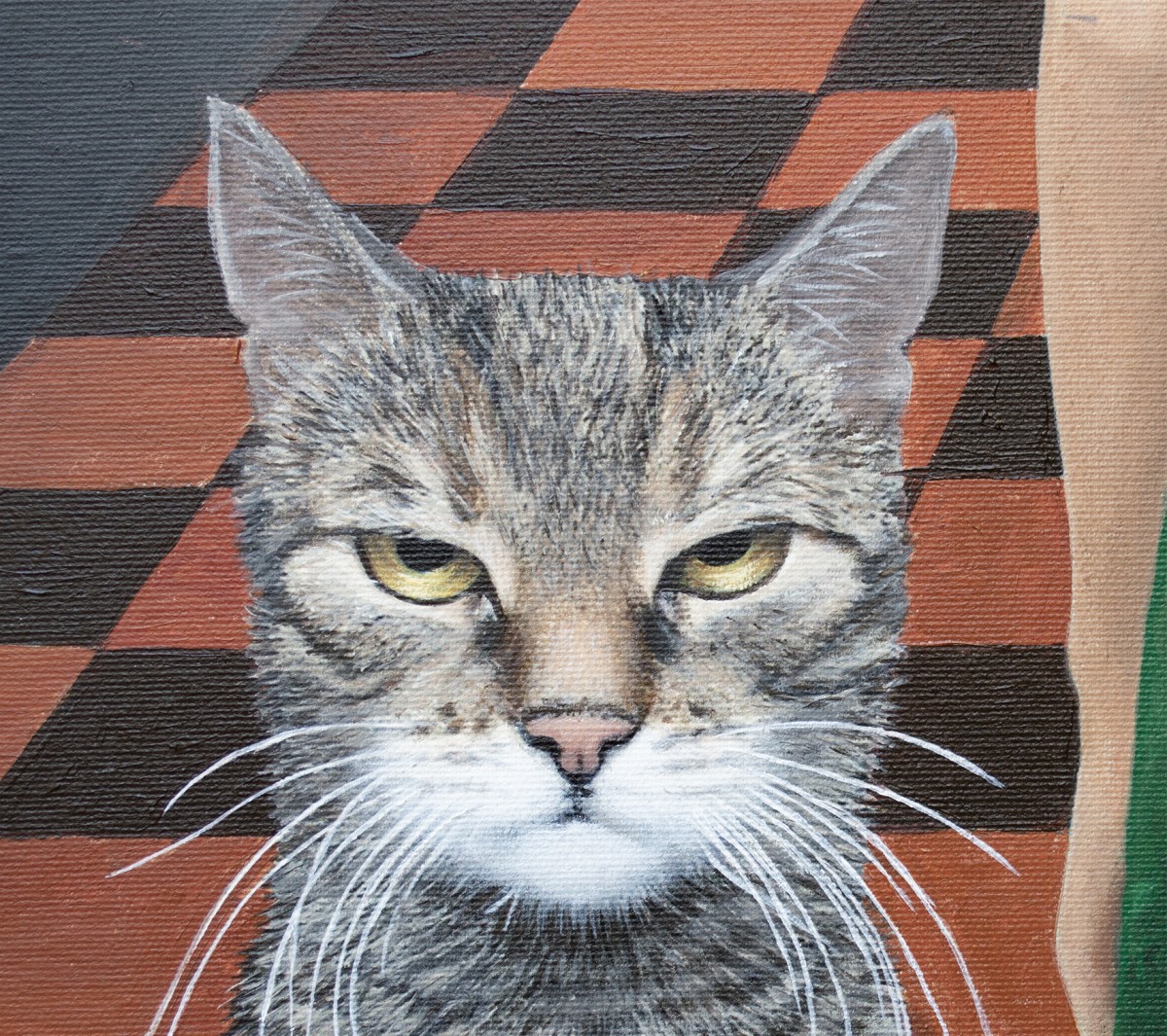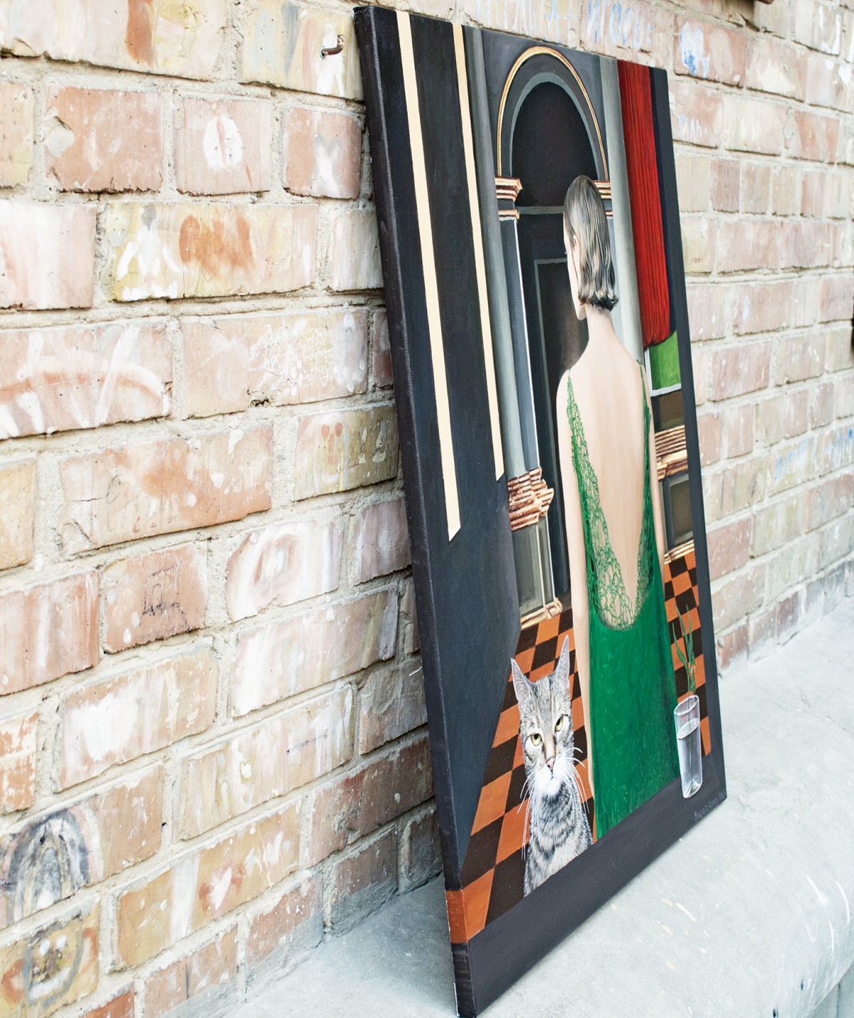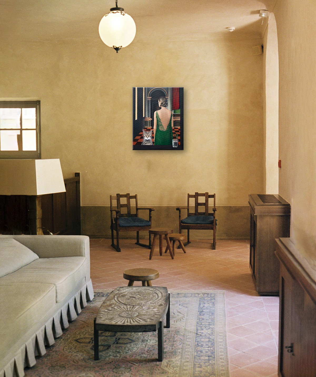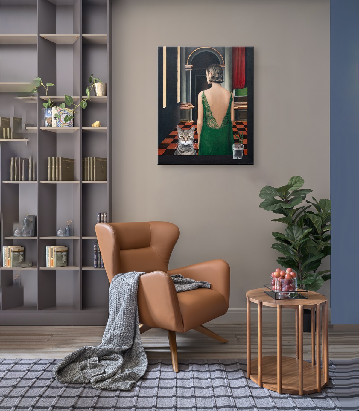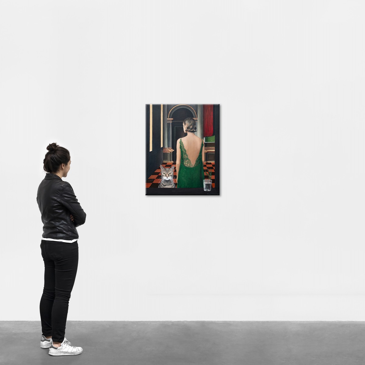 This painting is an portrait of a woman and my beloved cat, Avessalom. The green dress, red curtain, and checkerboard floor create a symbolic stage where mystery and serenity coexist. Avessalom is my guardian, confidant, and a silent witness to untold stories. His presence brings warmth, intrigue, and a sense of living narrative to the scene. Every detail reflects my personal vision and invites the viewer into a private world of elegance, subtle symbolism, and quiet storytelling. The interaction between the woman and Avessalom adds a layer of intimacy, turning this work into a reflection on companionship, observation, and hidden stories. Created with Dutch acrylic paints Amsterdam™ on Italian Unico canvas, finished with a satin varnish, with edges painted in the background color. Mounted on a pre-stretched canvas over a sturdy wooden frame and carefully packed in a cardboard box with layers of bubble wrap. Signed and accompanied by a certificate of authenticity.