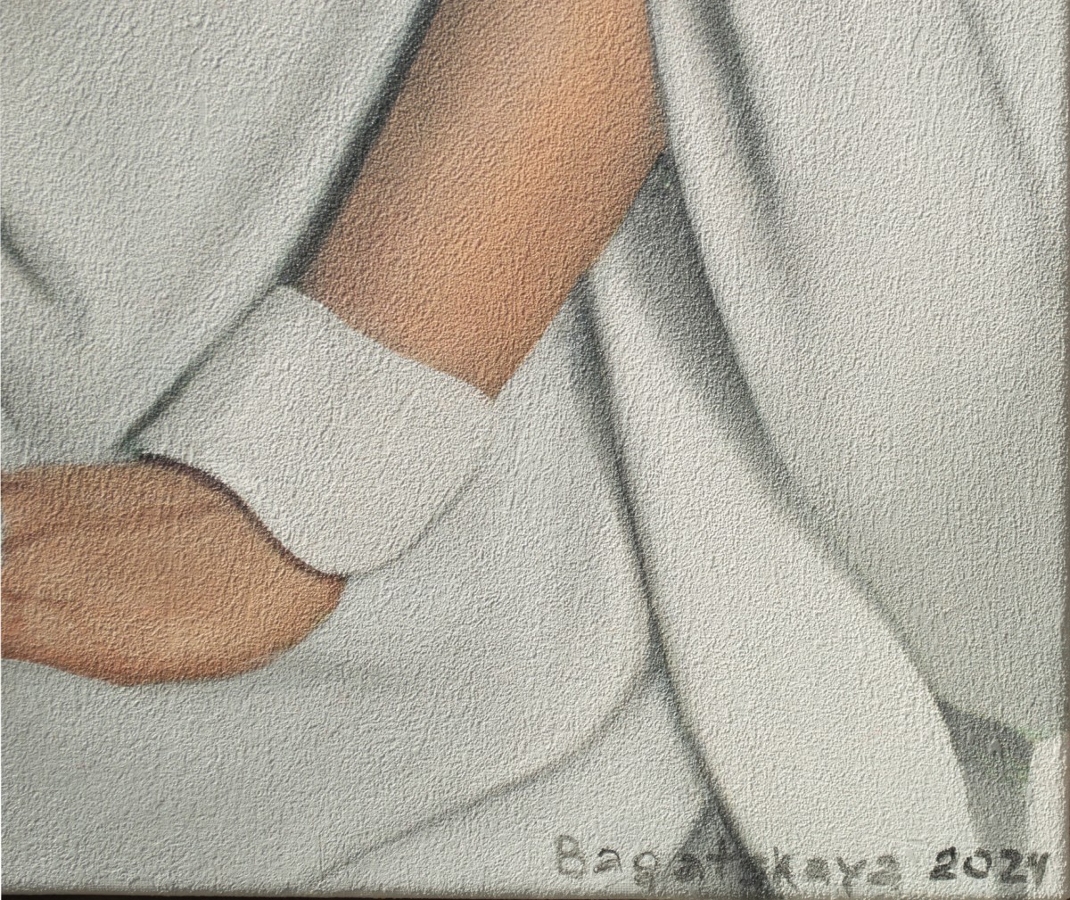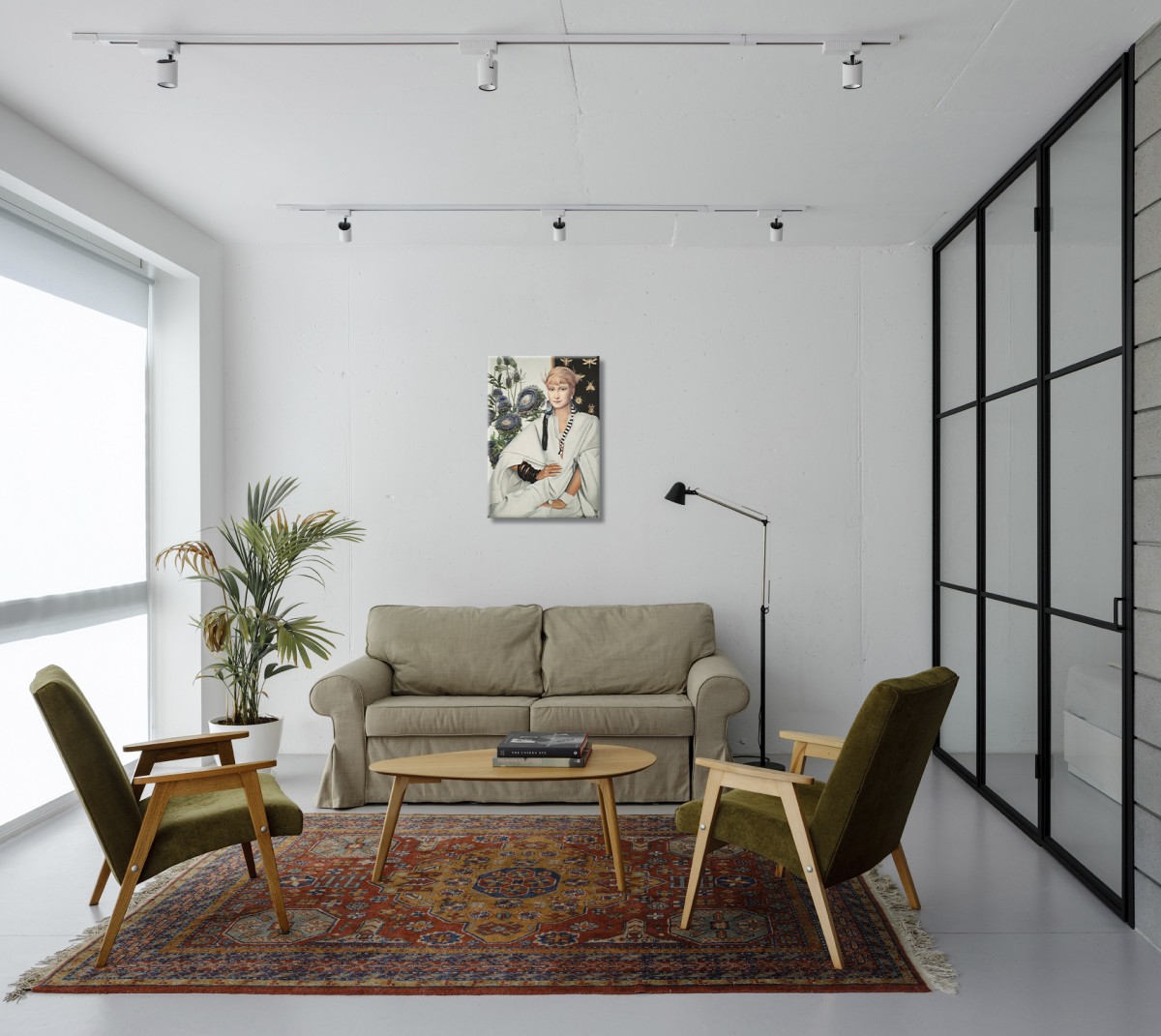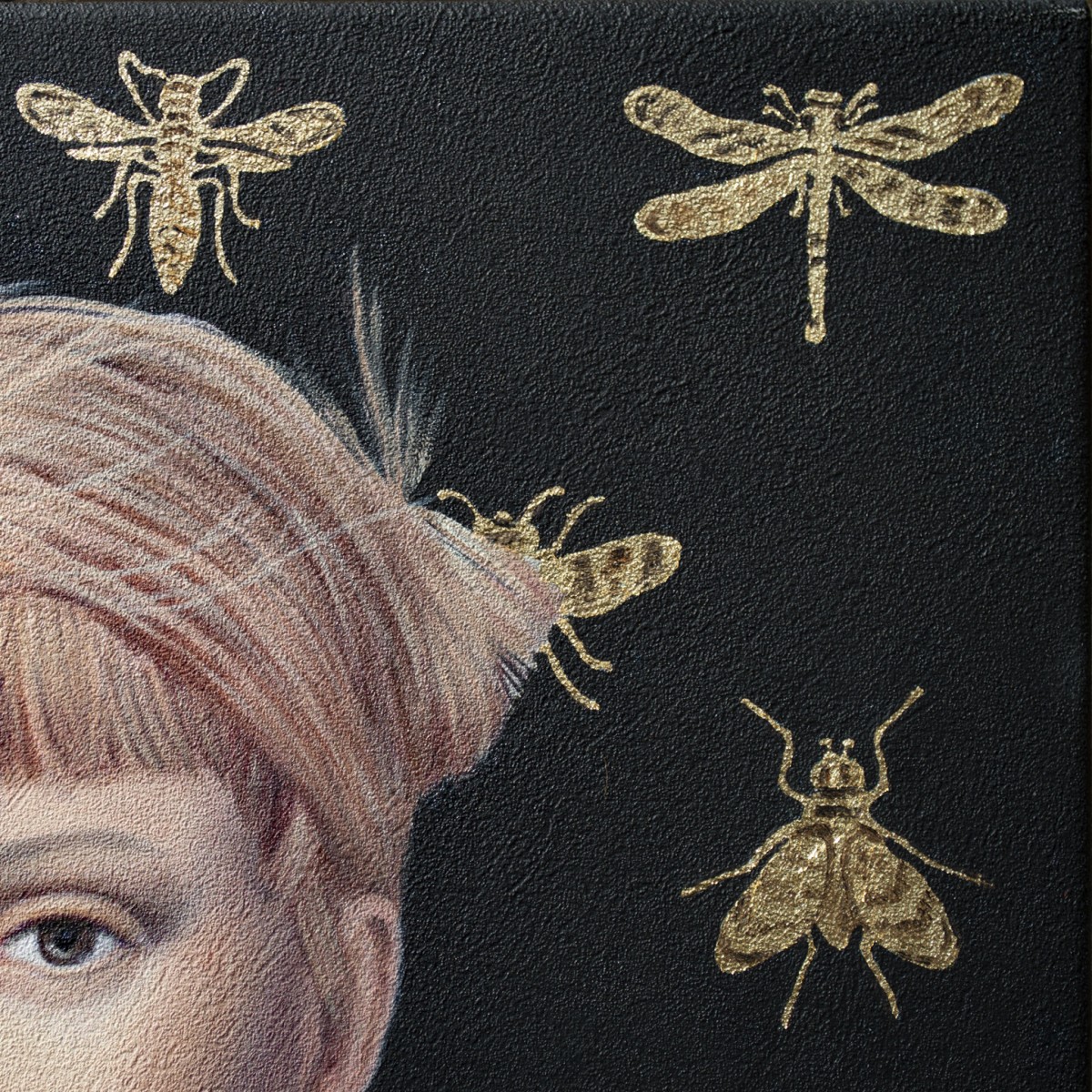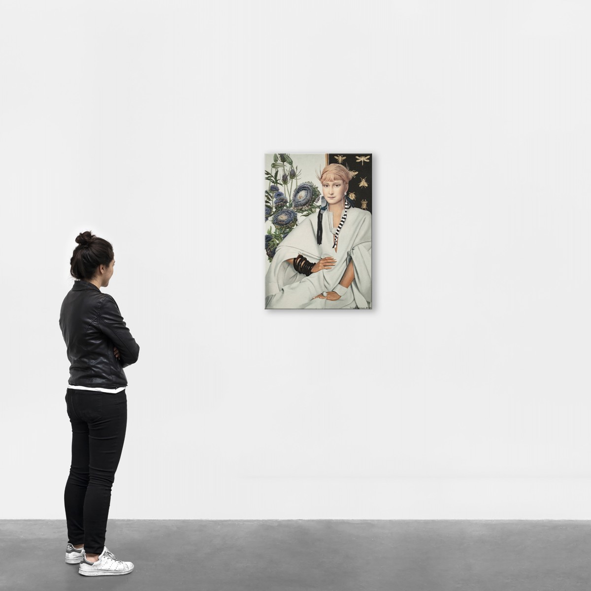 "In winter, we will go to the Natural History Museum," my husband said. Winter has passed, but we never went to the museum.In this painting, I've interwoven the essence of nature's intricacies with human introspection. The fusion of acrylic and oil breathes life into the subject, draped in tranquility, amidst a realm of floral and entomological motifs. This piece is a silent conversation, symbolic of our interconnectedness with the natural world, aiming to evoke a profound sense of contemplation and harmony in your space.