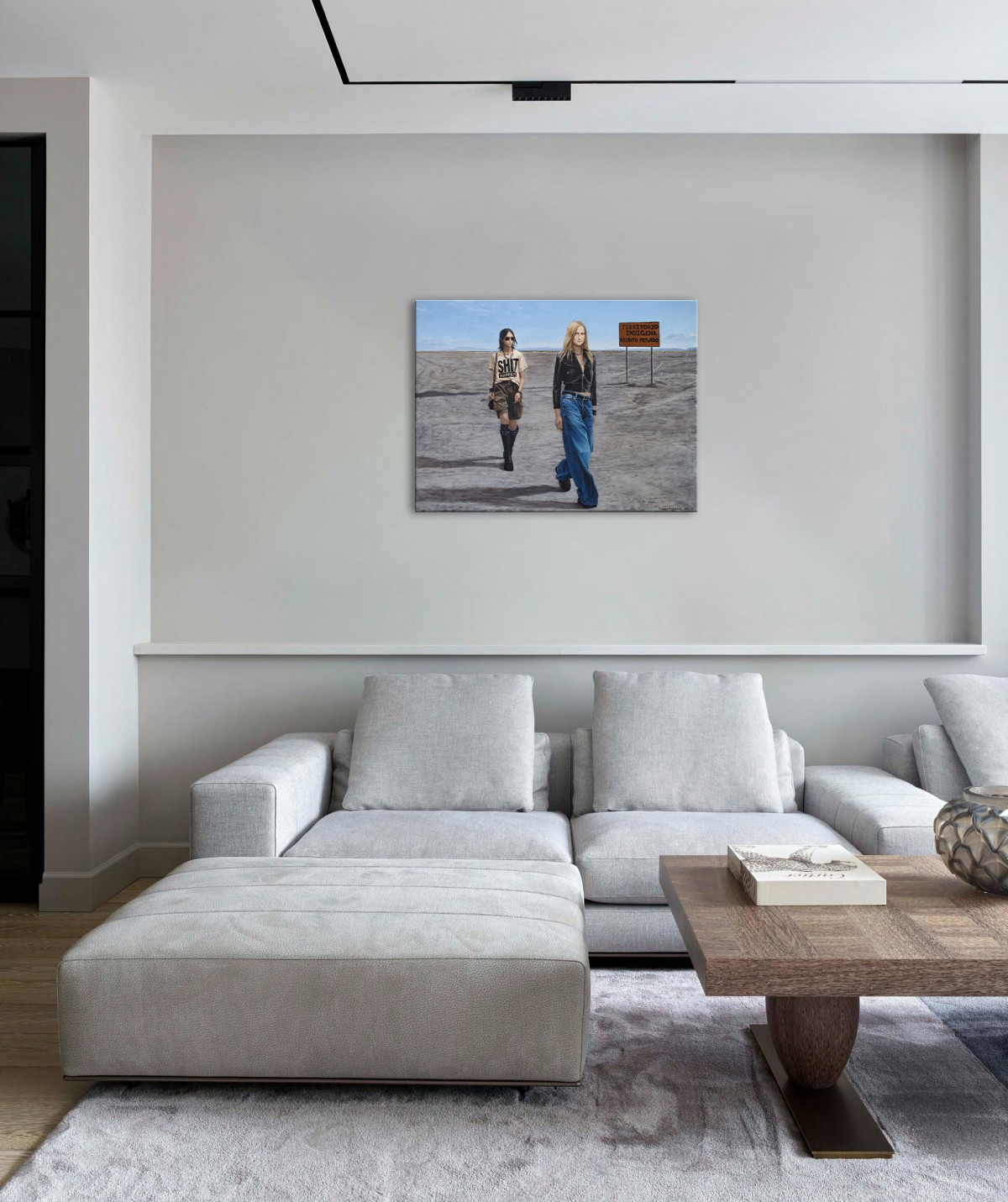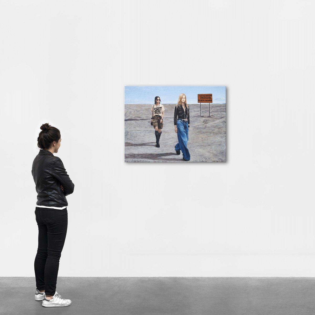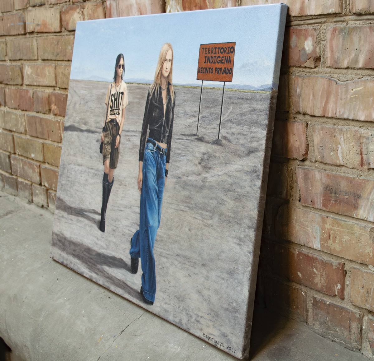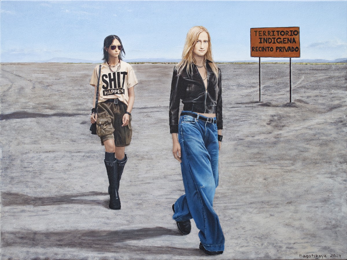 This painting contrasts contemporary fashion with a vast, sunlit desert, emphasizing the clash between modern style and an untouched, remote landscape. Two young women—one in a bold "SHIT HAPPEN" T-shirt and casual attire, the other in a sleek black leather jacket and jeans—walk through the barren terrain. The background features a sign reading "TERRITORIO INDIGENA RECINTO PRIVADO," adding cultural and political commentary. The artwork blends modern individuality with a sense of isolation, prompting reflection on the impact of contemporary lifestyles on traditional and sacred spaces.