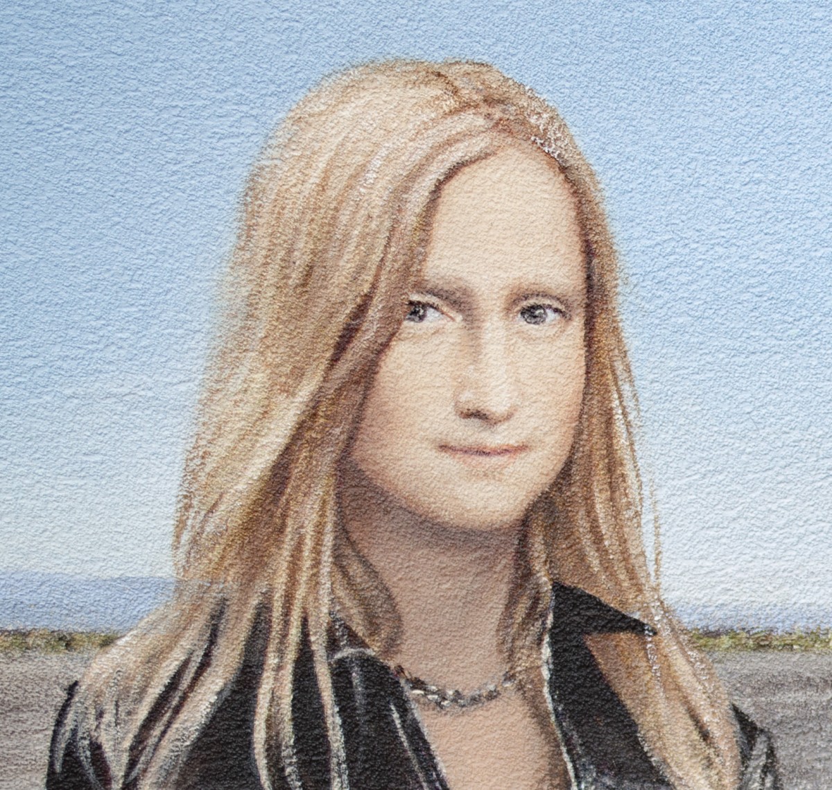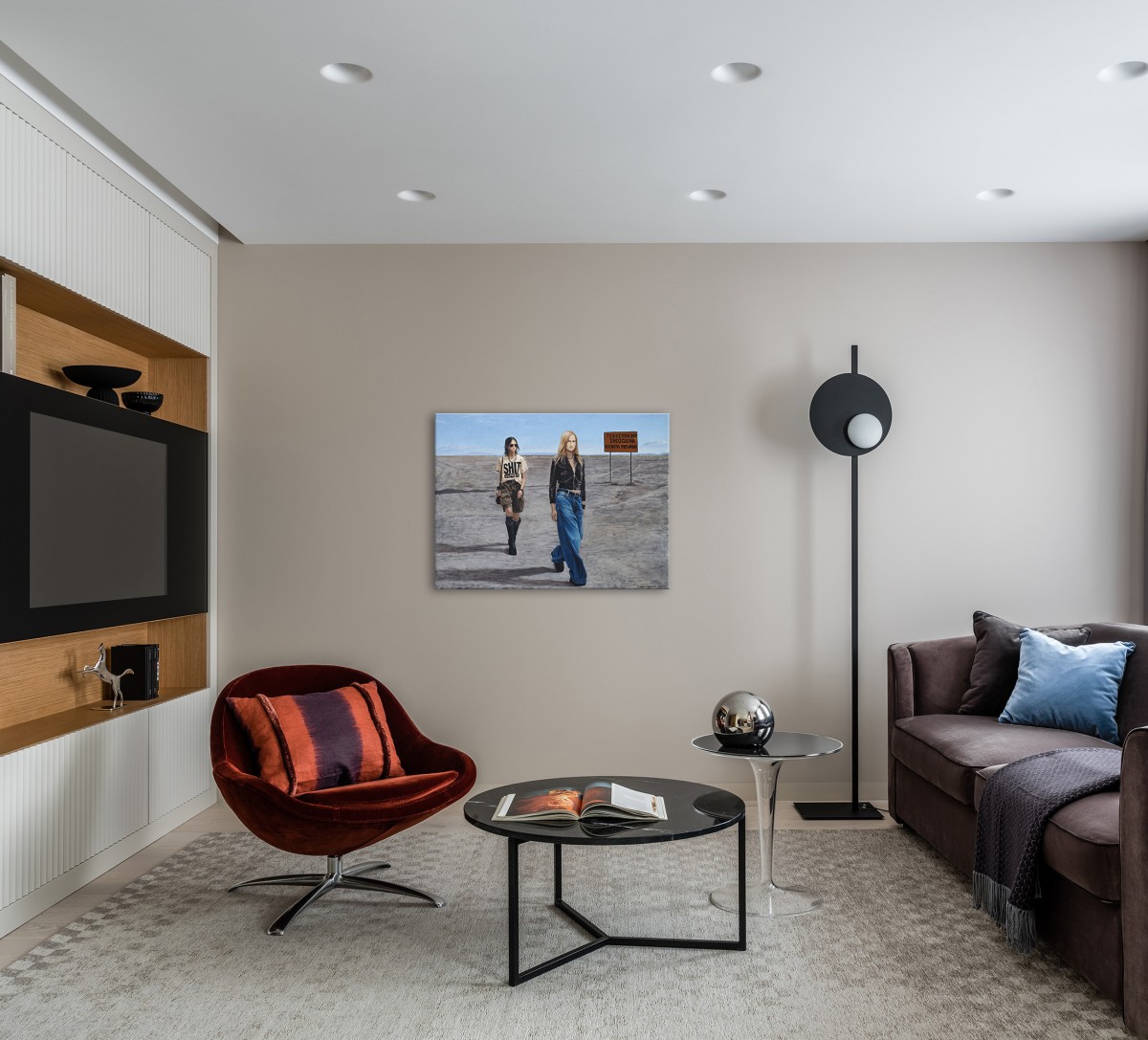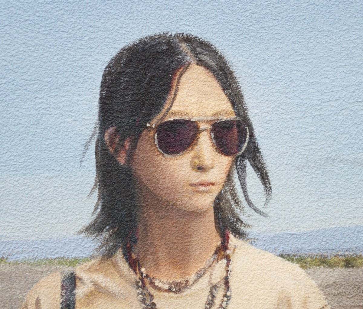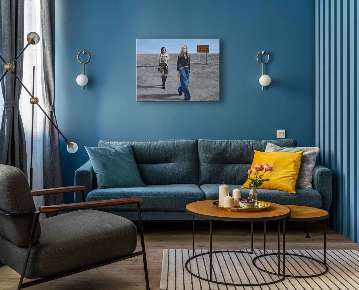 This painting contrasts contemporary fashion with a vast, sunlit desert, emphasizing the clash between modern style and an untouched, remote landscape. Two young women—one in a bold "SHIT HAPPEN" T-shirt and casual attire, the other in a sleek black leather jacket and jeans—walk through the barren terrain. The background features a sign reading "TERRITORIO INDIGENA RECINTO PRIVADO," adding cultural and political commentary. The artwork blends modern individuality with a sense of isolation, prompting reflection on the impact of contemporary lifestyles on traditional and sacred spaces.