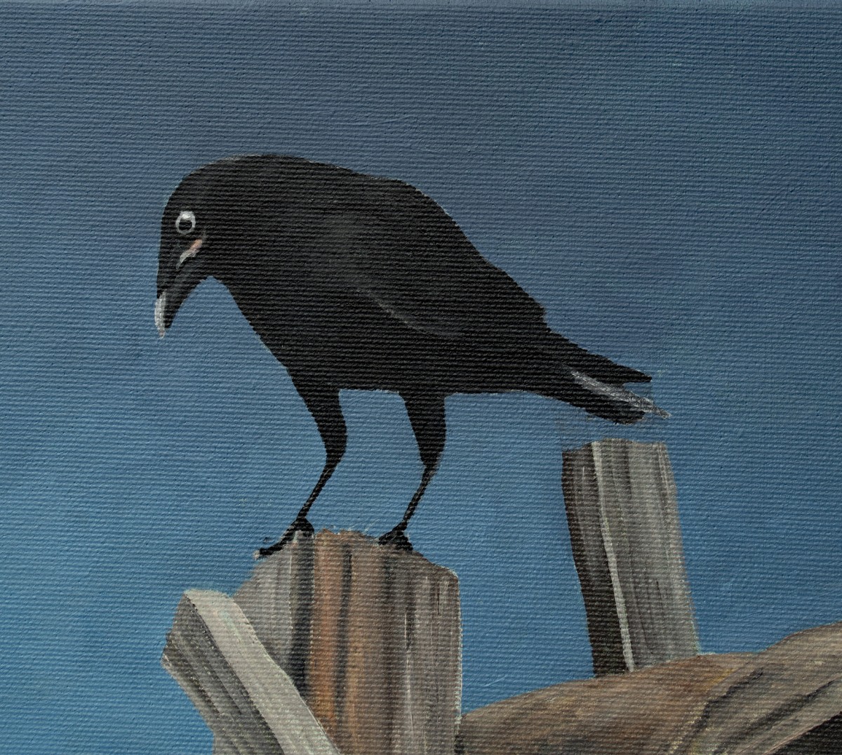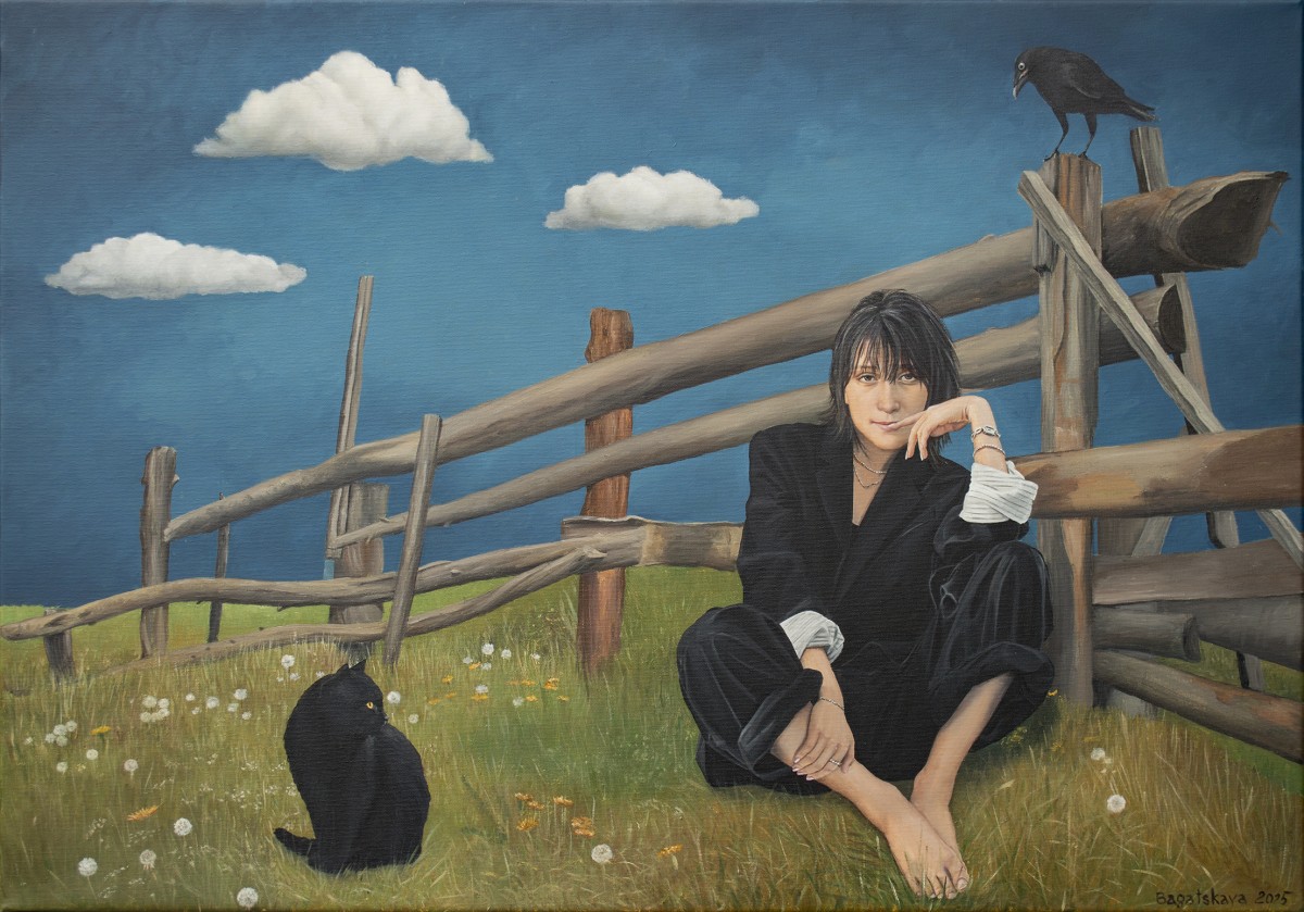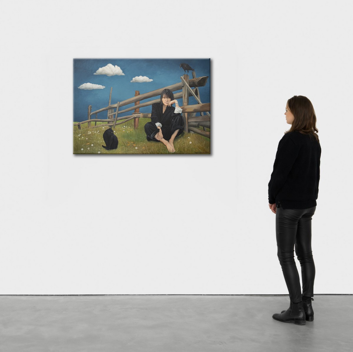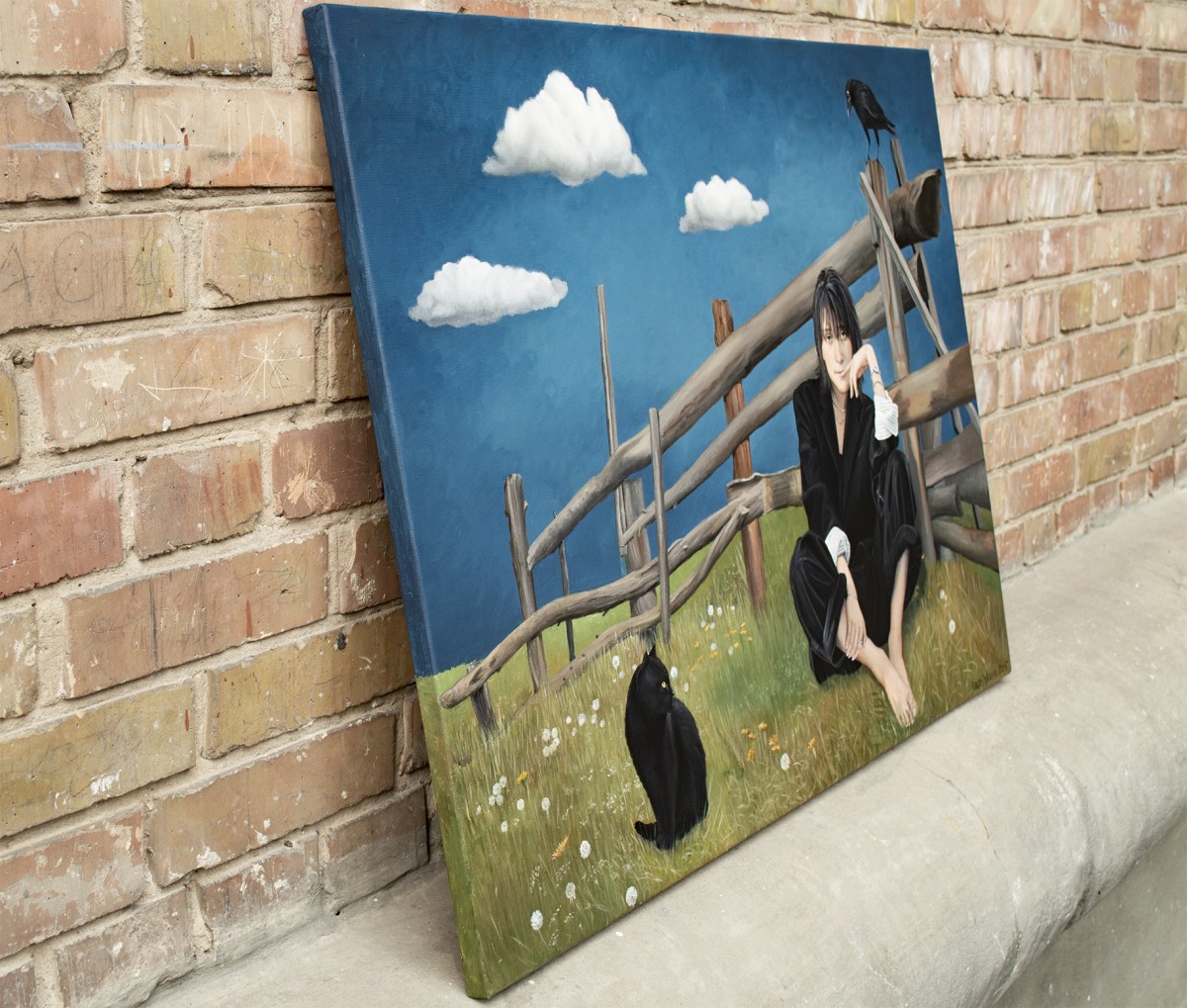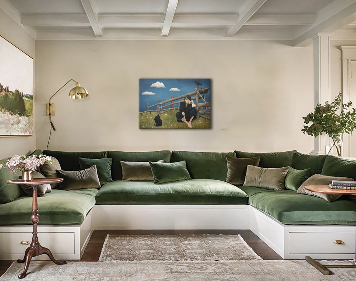A dreamlike moment suspended in silence. A woman in black sits barefoot by a rustic fence under a vast blue sky. A cat and a crow — silent guardians — complete the fragile harmony of stillness. The scene feels both earthly and ethereal, evoking calm, curiosity, and the quiet power of self-awareness. This artwork speaks to those who find poetry in solitude and elegance in simplicity. It holds space for reflection, presence, and emotional balance — a timeless vision that whispers rather than shouts.