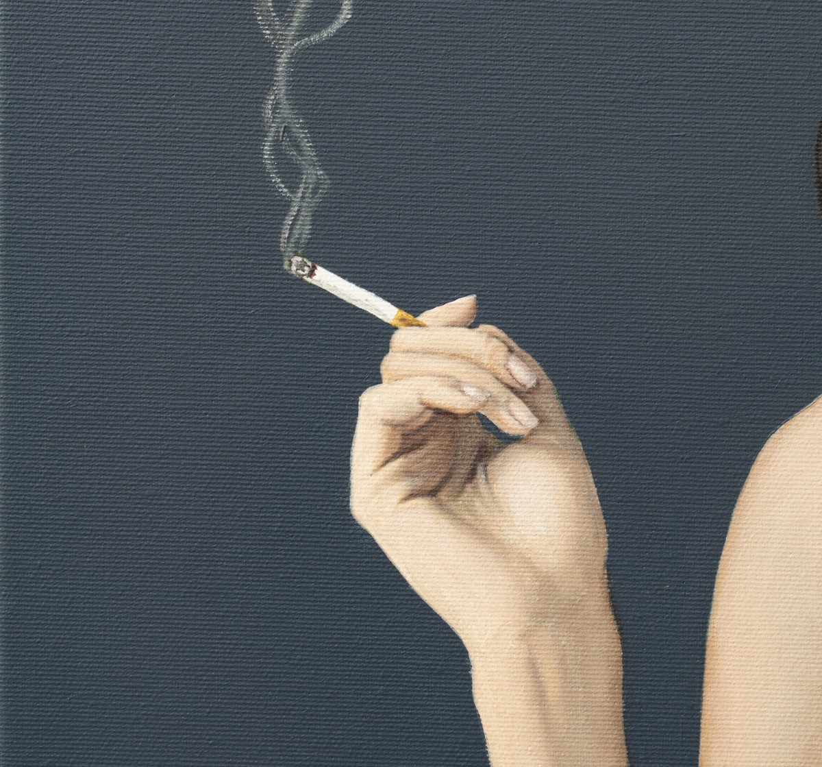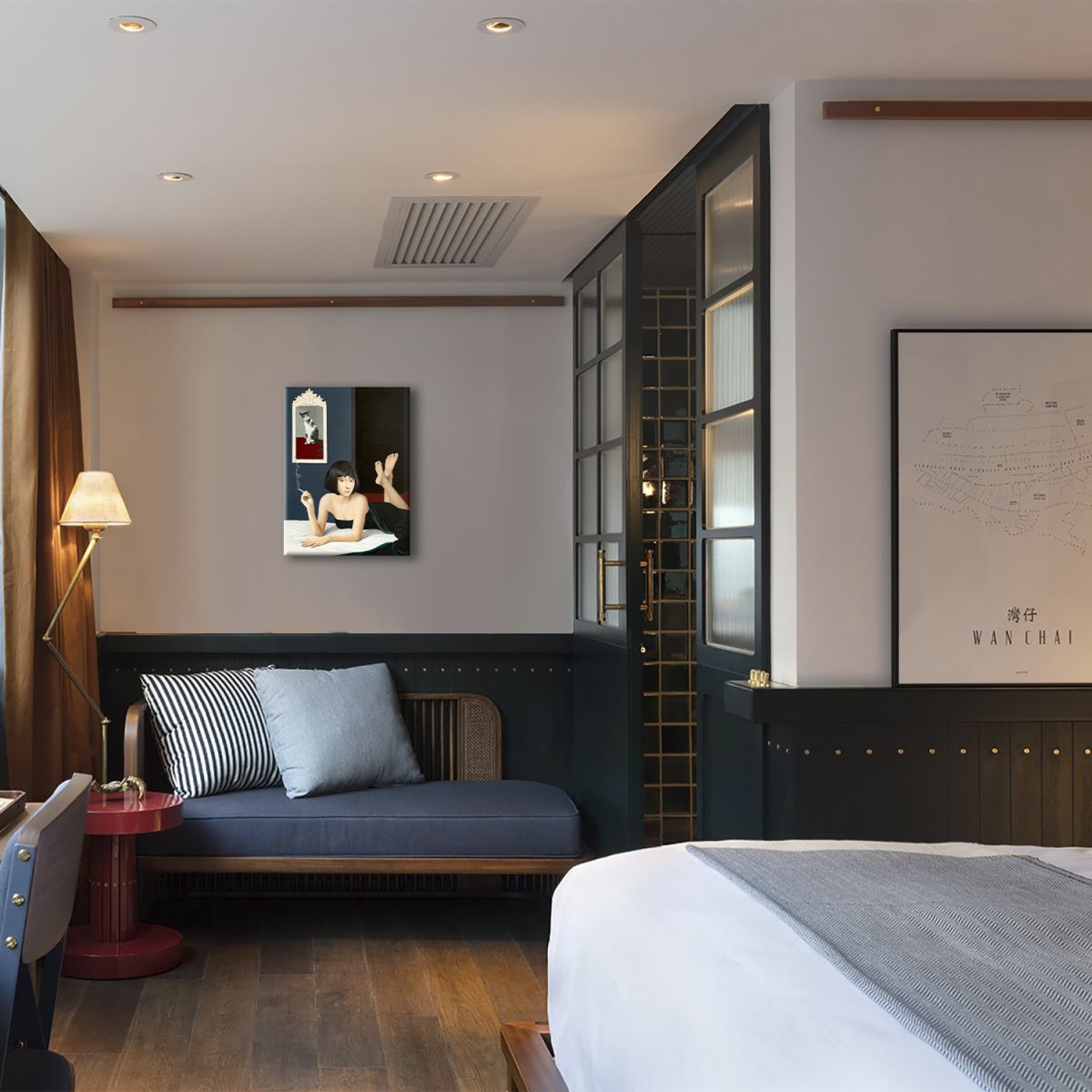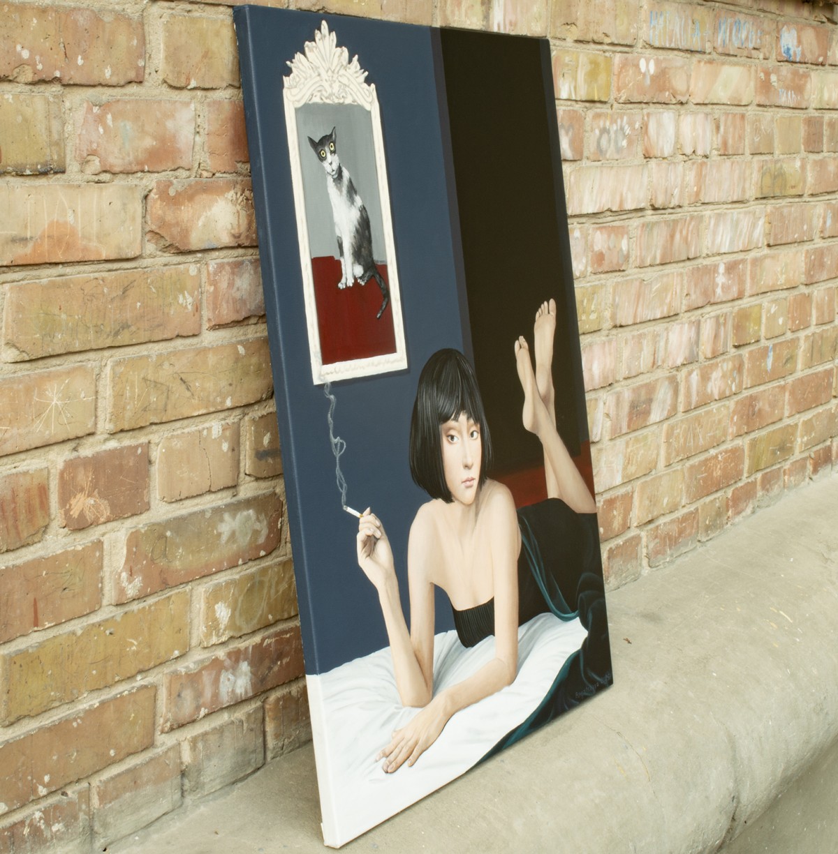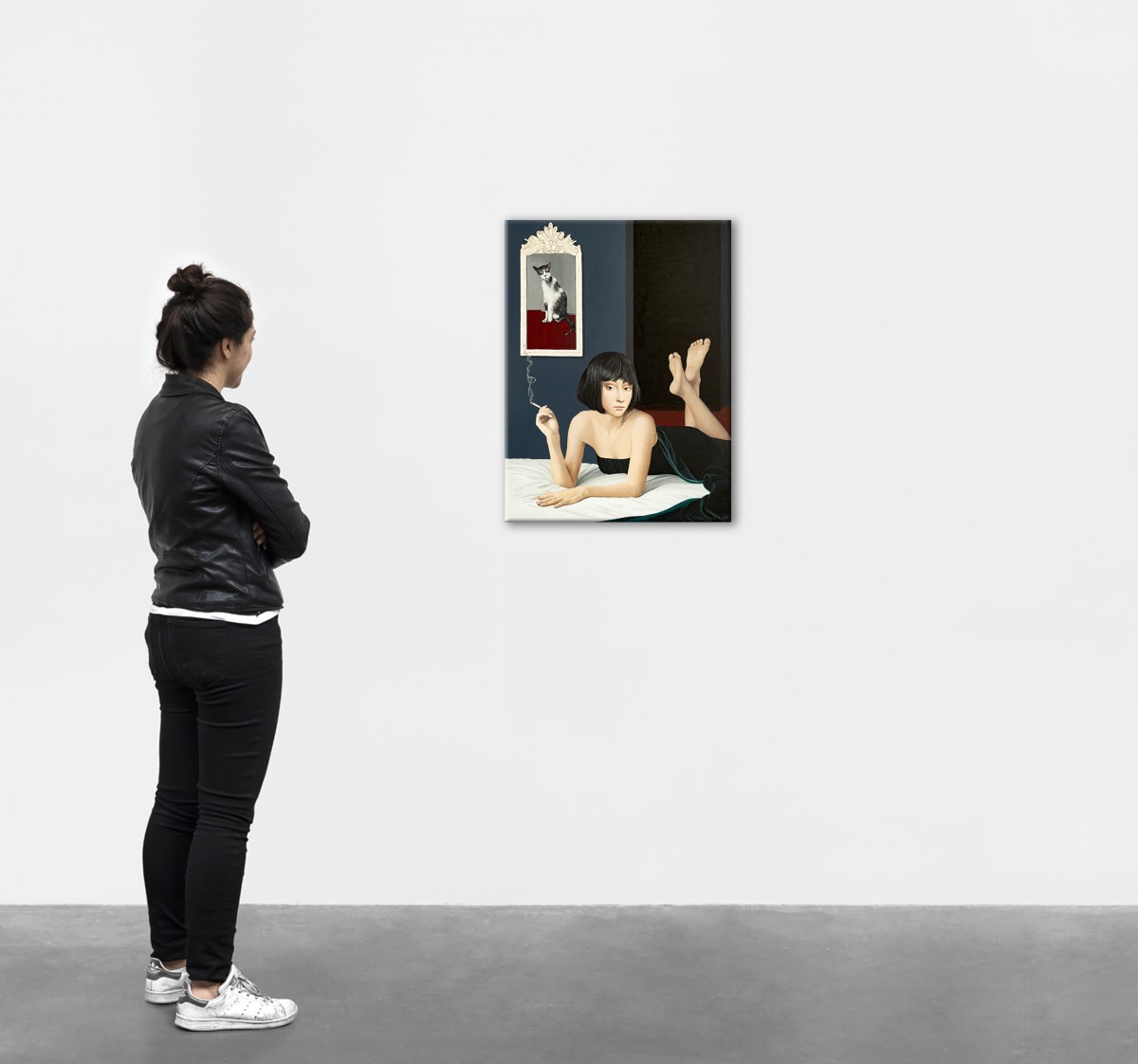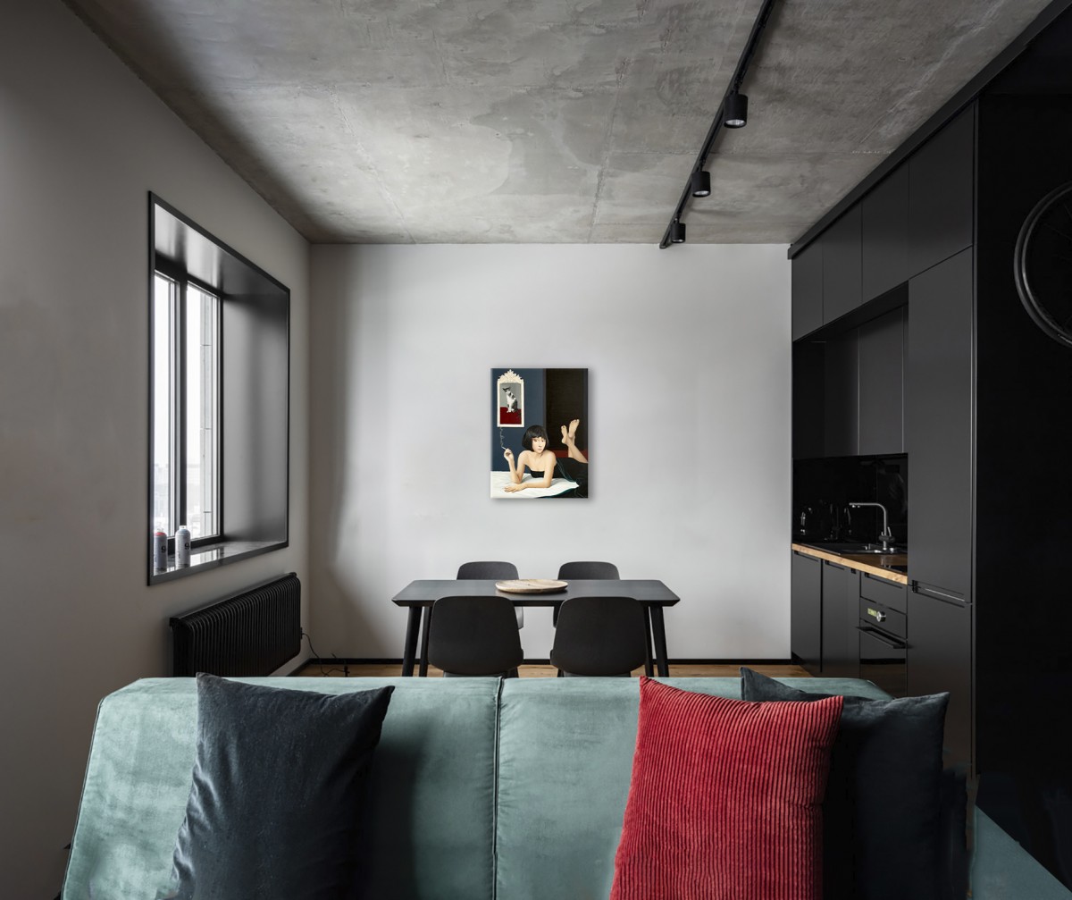 A woman lies gracefully on a bed, holding a cigarette, her thoughtful gaze pulling the viewer into a quiet, cinematic scene. A framed cat above her adds a surreal accent, like a silent observer. The contrast of pale skin, black fabric, and deep blue walls creates both intimacy and mystery. The atmosphere feels frozen in time—soft, magnetic, and unforgettable.