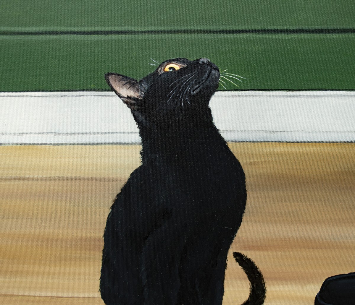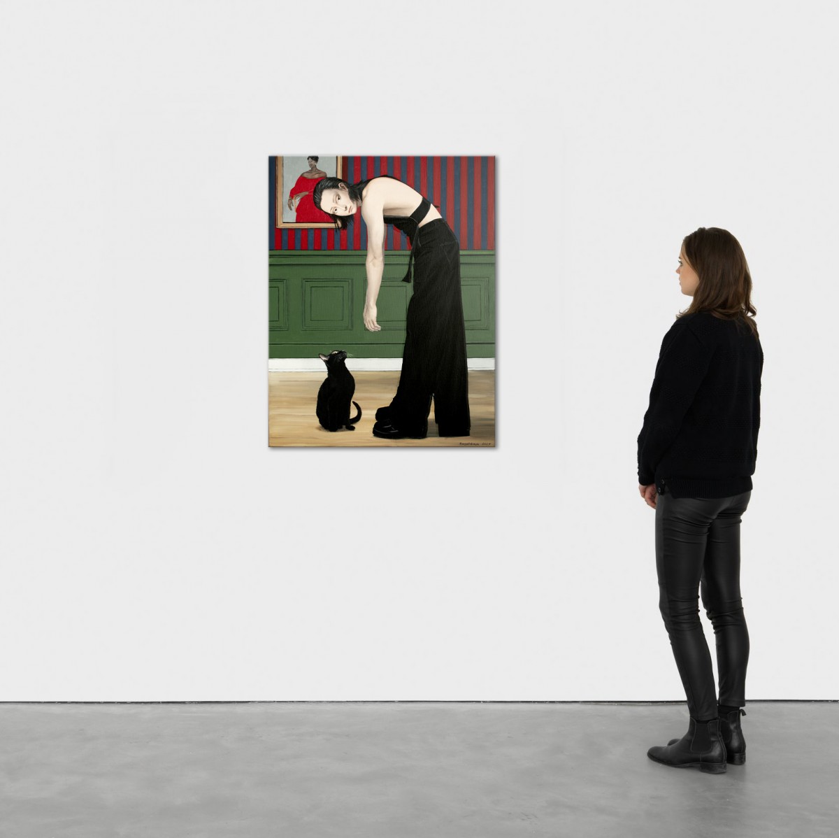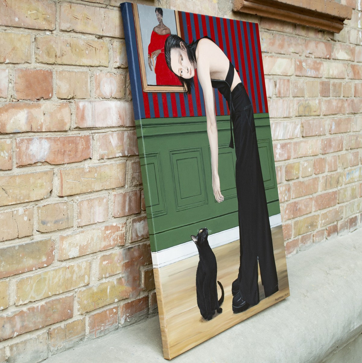 In To Hold or Just to Pet, the artist captures a moment suspended between tenderness and hesitation. A woman bends gracefully toward a black cat — her posture forming a soft question mark, a gesture caught between action and contemplation. The cat, calm and confident, gazes back with silent understanding. What happens in that invisible space between them feels more human than words can express.