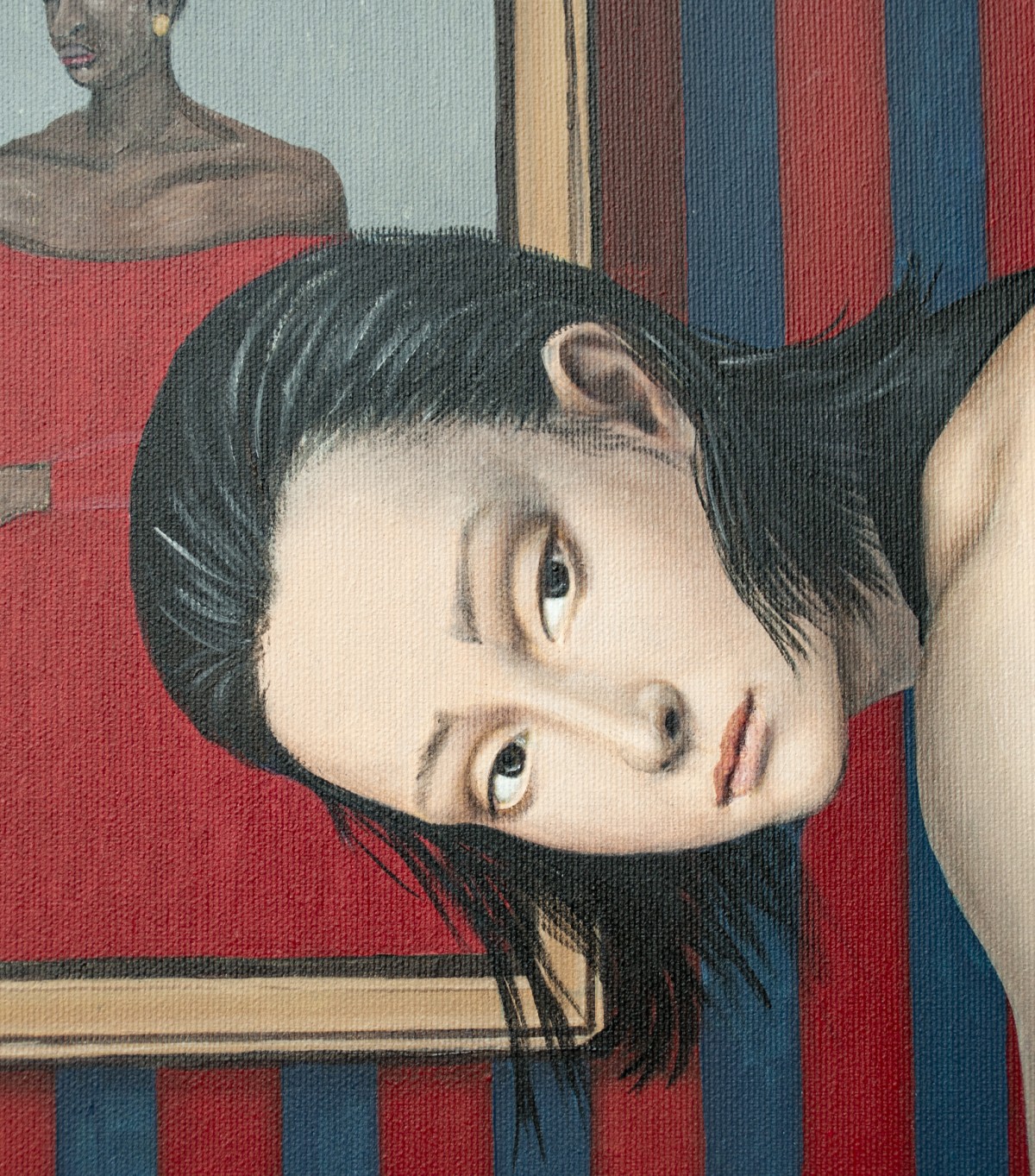 The intimate interior — green panels, red-and-blue striped walls, a framed portrait behind — becomes a theater of subtle emotions. Every line, every brushstroke invites you to pause and feel that fragile balance between affection and restraint, curiosity and reverence.