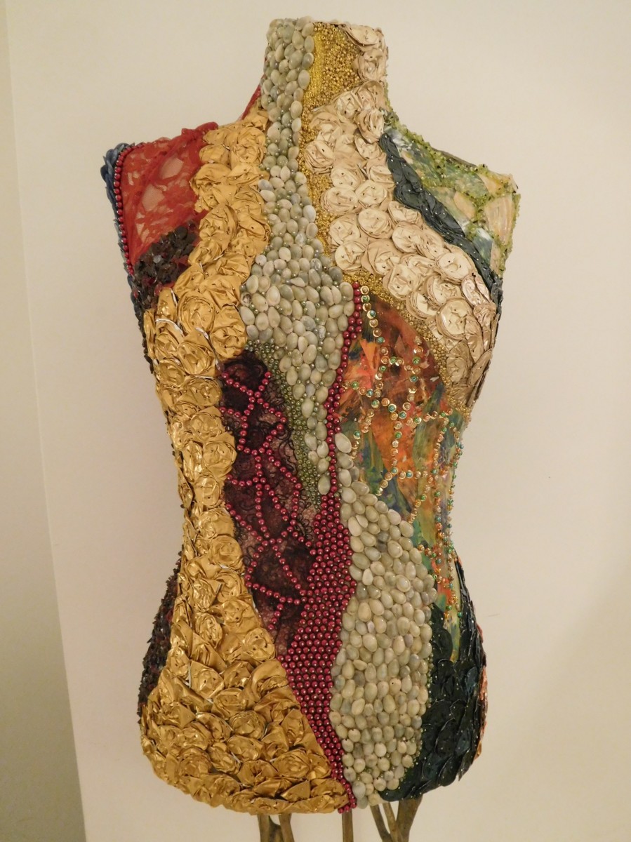 bust depicting Eve in Eden . Covered with pieces shelves ,metallic pieces, lace, paint....