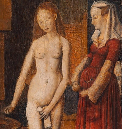 Two copies of this painting were made around the end of the 15th century, and this is the only way we know about this picture. It depicts a naked woman having a sponge bath, accompanied by a maid. There are several similarities with the pose and setting of The Arnolfini Portrait, which is how historians can be so confident the original was done by van Eyck.
