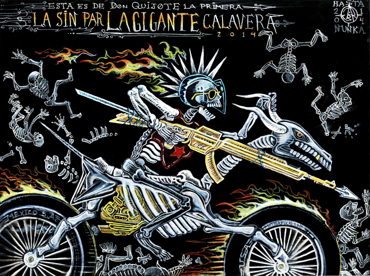 Skeleton riding a fire breading bike, rolling over skulls n' bones