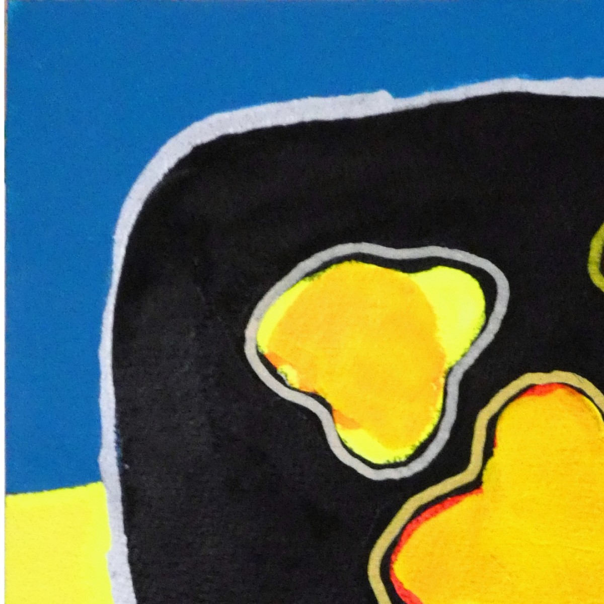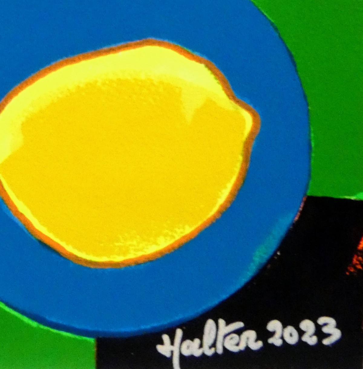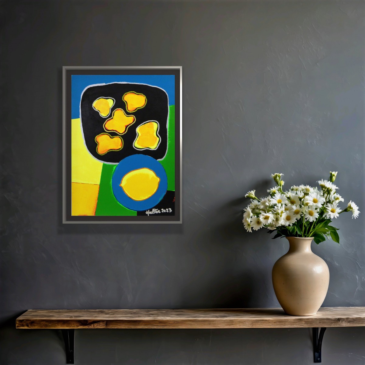 “Citron et bouquet de fleurs” ©alainhalter 2023. Acryliques extra fines Rembrandt et Amsterdam Talens (emploi de couleurs fluorescentes), feutres Posca sur papier aquarelle Arches grain torchon 185g/m². Année : Aubervilliers, mai 2023. Format : 31 (largeur) x 41 (hauteur) cm. Hors encadrement. Pièce unique.