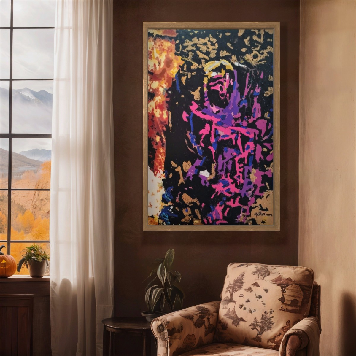 "Eveil debout" (d’après diapographique #47-1) ©alainhalter 2024. Peinture numérique et acrylique sur toile montée sur châssis. Bords noirs. Année : septembre 2024. Format : 62 (largeur) x 93 (hauteur) cm. (Les couleurs de la photo sont légèrement amoindries par rapport à l'original en raison de l'utilisation de peintures métalliques). Hors encadrement. Encadrement sur demande avec devis. Diapographiques : ce sont à l’origine de véritables diapositives fabriquées avec des morceaux de tissus, des végétaux, des fragments de plastiques ou de cartons, des encres sur transparents… des brûlures au fer à souder, des grattages sur film inversible… Le tout étant ensuite numérisé. Peinture numérique : A partir d’une numérisation ou d’une capture photographique, j’interviens à l’aide de logiciels de création sur ordinateur, tablette ou smartphone. J’imprime ensuite mes fichiers en haute définition sur papier d’art ou sur toile montée sur châssis. Puis je peins manuellement sur ces impressions hautes qualités. Notez que chaque pièce est une réinterprétation et donc une création unique.