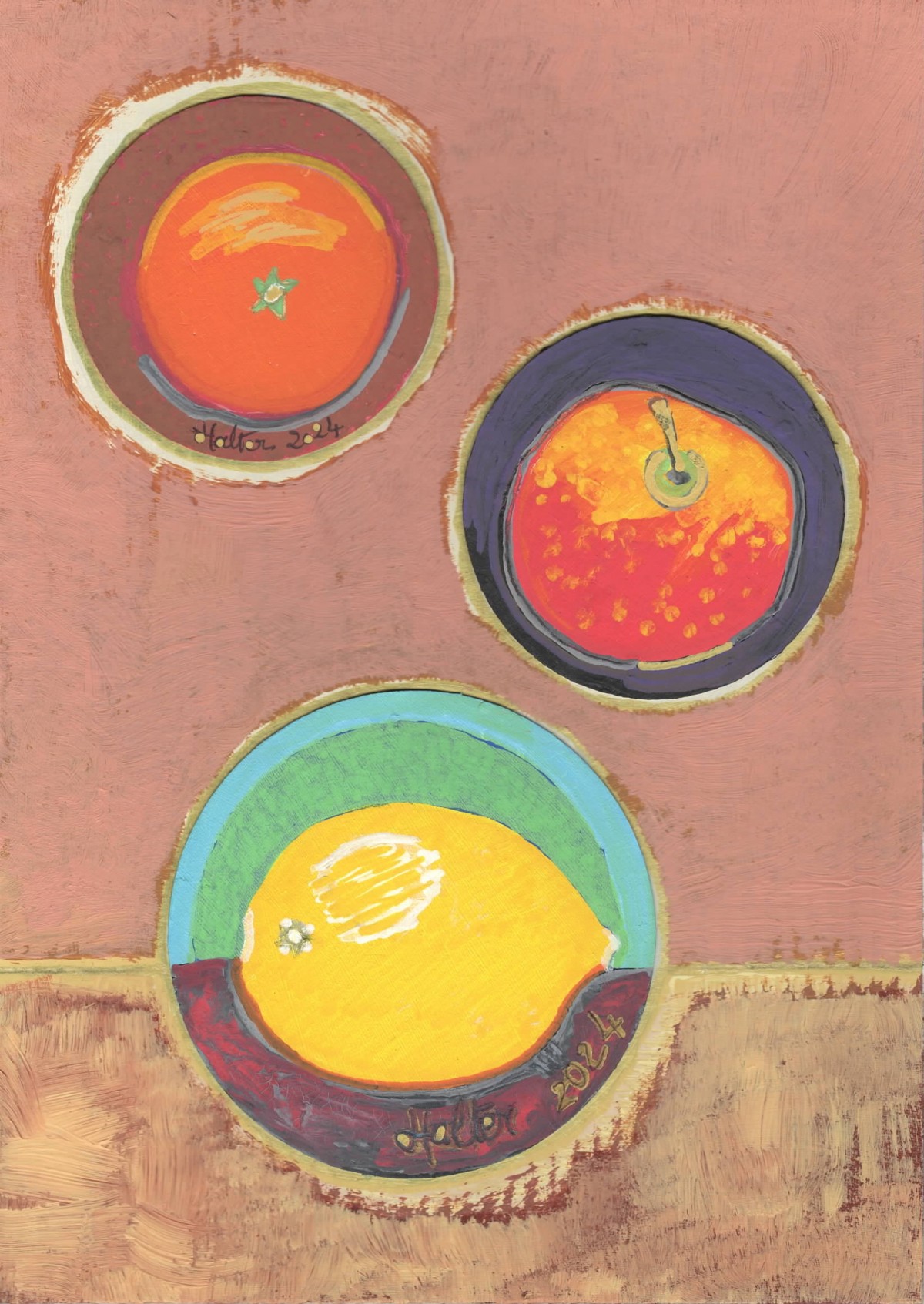 "Fruits ronds" ©alainhalter 20244. Collage de cartons, marqueurs et peinture acryliques. Année : Aubervilliers, avril 2024. Format A4 : 21 (largeur) x 29,7 (hauteur) cm. Encadrement Gerstaecker Umbria en bois noir avec verre. Pièce unique.