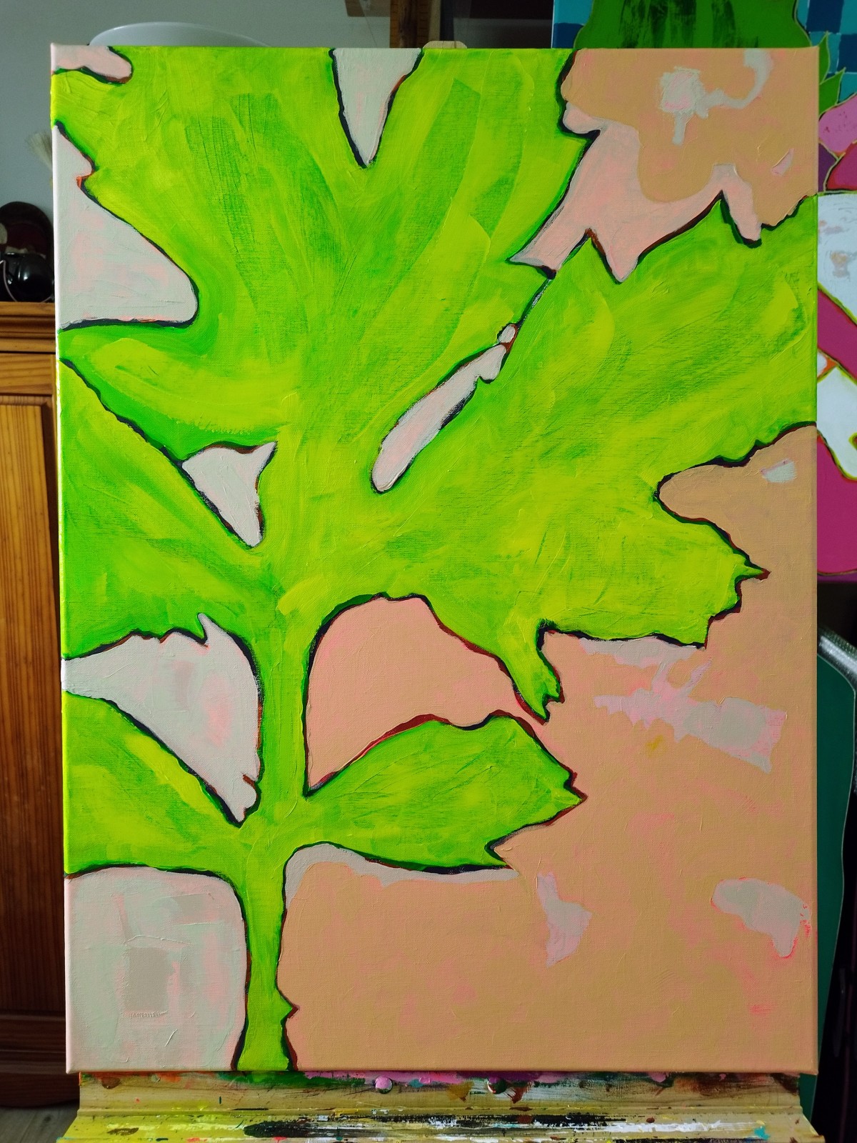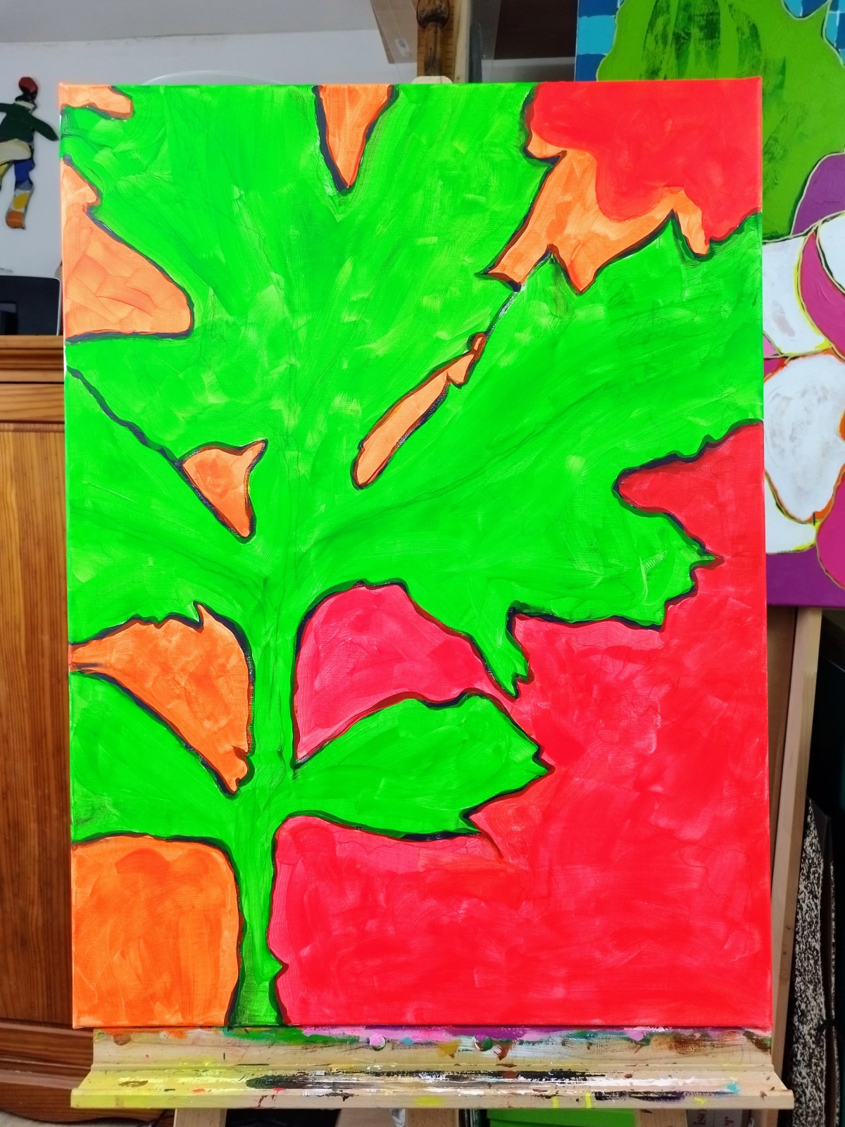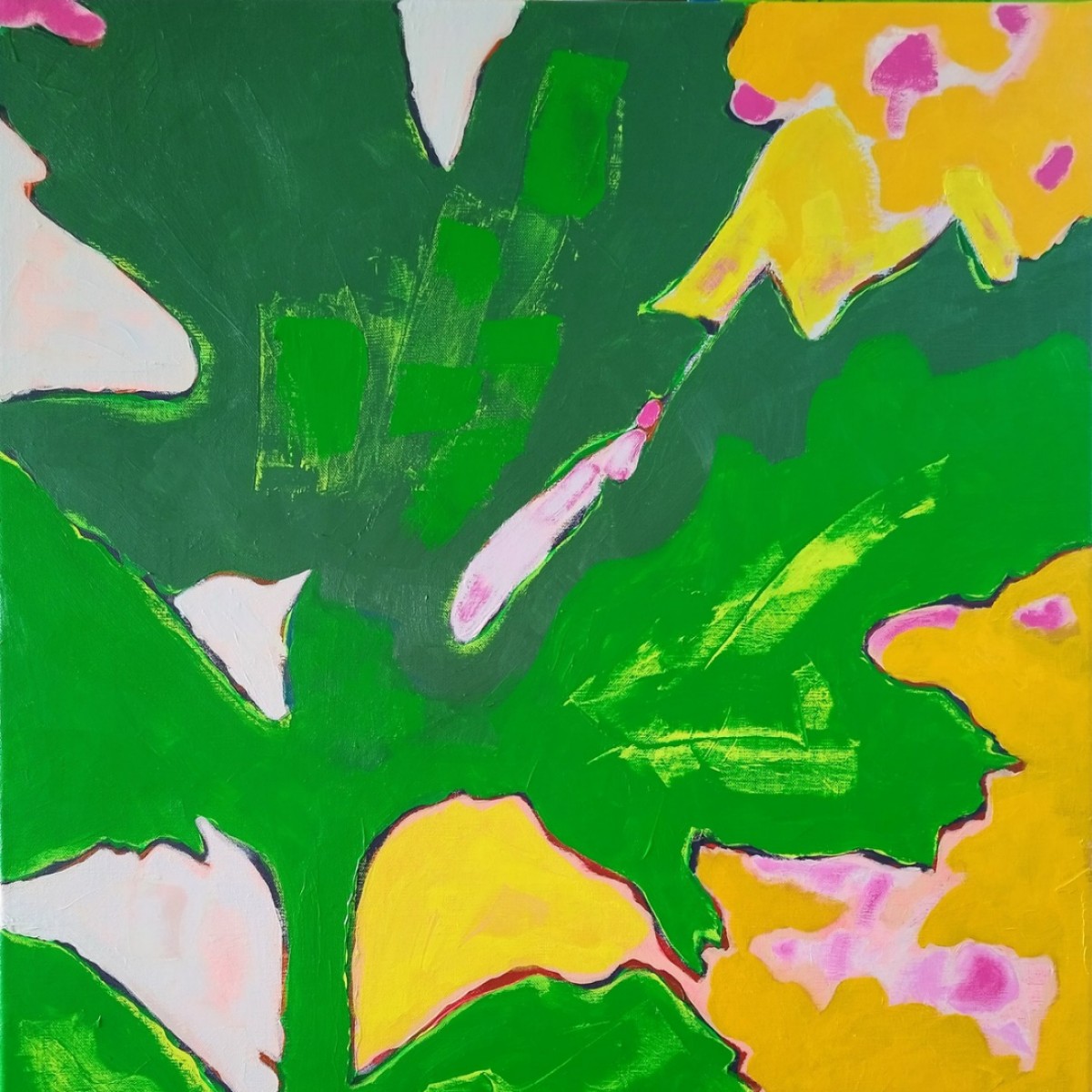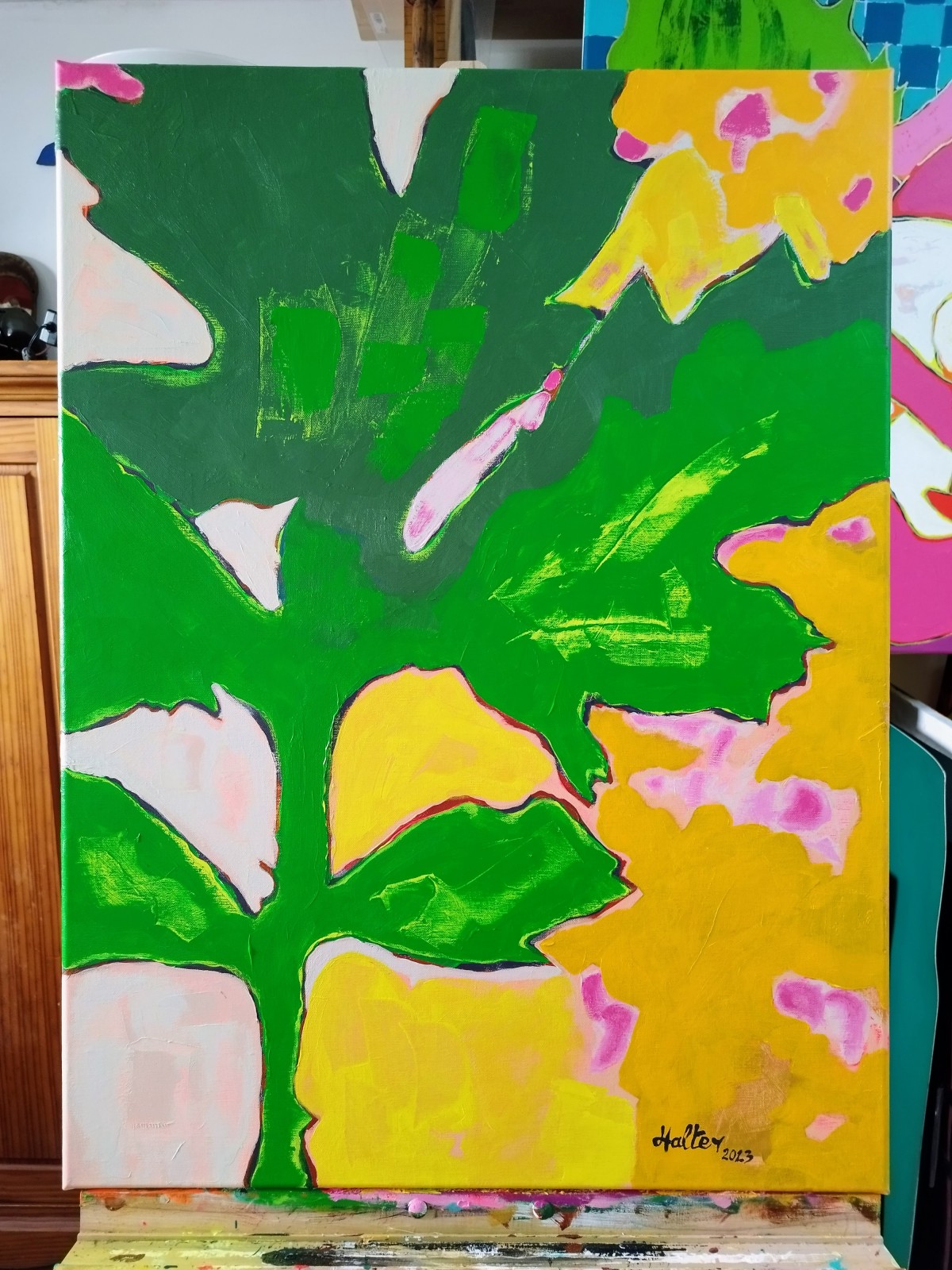 “Jeune pousse" (d’après diapographique #55) ©alainhalter 2023. Châssis entoilé en lin, Acryliques extra fines Rembrandt et Amsterdam Talens, emploi de couleurs fluorescentes. Année : juillet 2023. Format 25P : 60 (largeur) x 81 (hauteur) cm. Hors encadrement. Pièce unique.