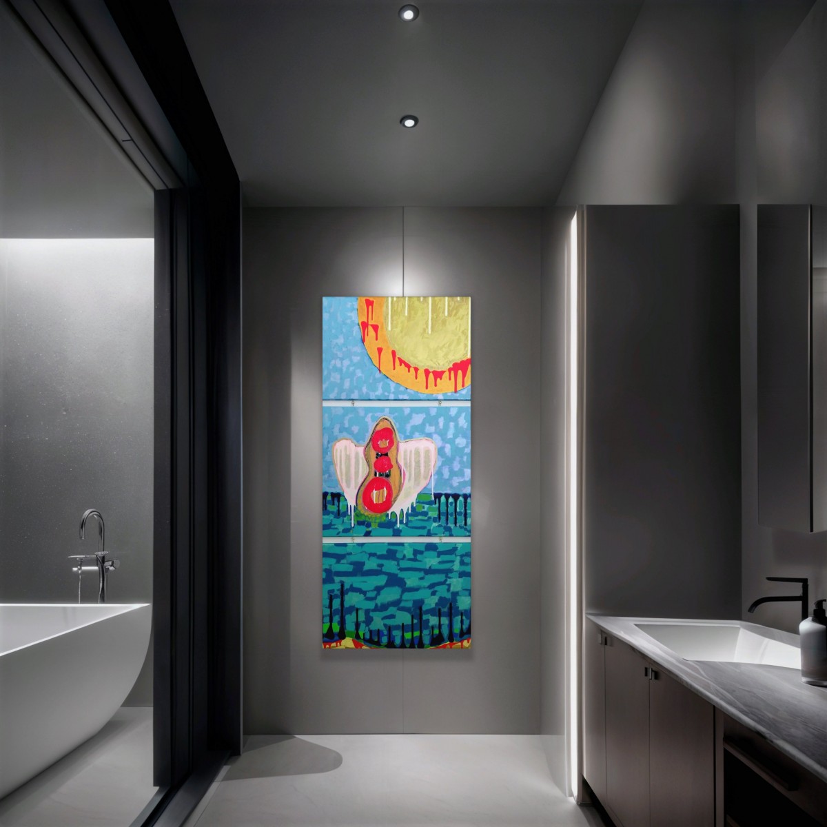 "La chute d'Icare" ©alainhalter 2024. Triptyque vertical formé de 1) Soleil, 2) Icare, 3) Abysse. Peintures acryliques Rembrandt et Amsterdam de Royal Talens rehaussées de pastels à l'huile Sennelier, pouring acryliques utilisées en coulures contrôlées sur toiles montées sur châssis Gerstaecker Classico. Tranches peintes. Année : novembre 2024. Format : 3 panneaux (25P) de 81 (largeur) x 60 (hauteur) cm, soit un ensemble de 81 (largeur) x 180 (hauteur) cm. (Les couleurs des photos sont légèrement amoindries par rapport à l'original en raison de l'utilisation de peintures métalliques et fluorescentes). Hors encadrement. Pièces uniques.