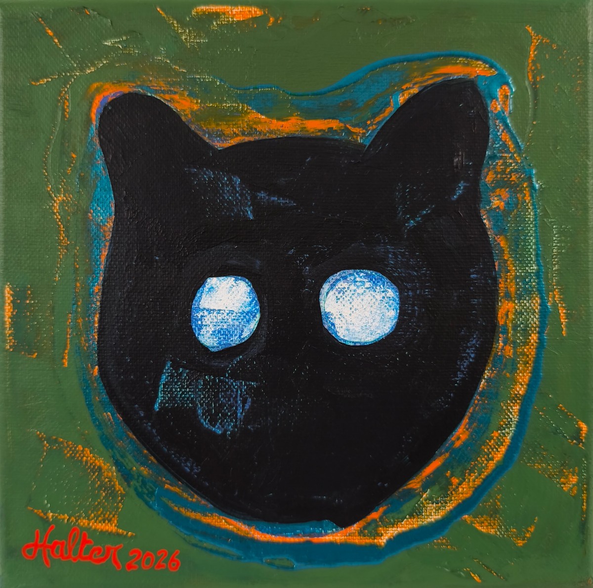 "Tête de chat noir aux yeux de verre" ©alainhalter 2026. Peintures acryliques Rembrandt et Amsterdam de Royal Talens, pouring expériences Pébéo acryliques sur toile montée sur châssis Gerstaecker Classico. Tranches peintes. Année : janvier 2026. Format : 20 x 20 cm. Hors encadrement. Pièce unique.